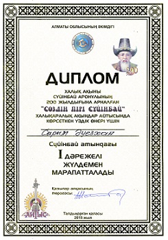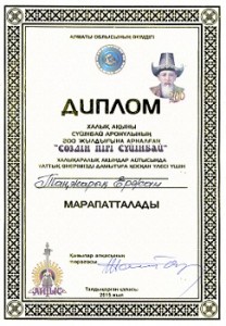 On October 21, 2015 the Akimate of the Almaty region organized the international poets’ aitys devoted to the 200-th anniversary of the national poet Суюнбай Aronuly in the town of Taldykorgan . The 4-year students of the specialty “The Kazakh Language and Literature” of the Eurasian Humanities Institute Syrym Auyezkhan and Tanzharyk Yerzhan took part in this event.