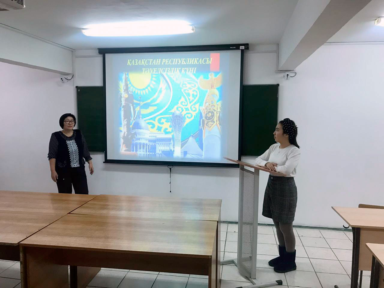 On the eve of the Day of Independence of the Republic of Kazakhstan in groups ПД 19-01 (curator Melnova K.V.) and ИЯК17-02 (curator Umbetova K.Ye.) there was held the curator’s hour devoted to the remarkable date –the 16-th of December. All the information was prepared by the students who took the initiative in searching the material, making presentations and conducting the curator’s hour. There was given the basic information on the theme of the curator’s hour, there was held mini-questionnaire among the students on the knowledge of the mane data in the history of our state.