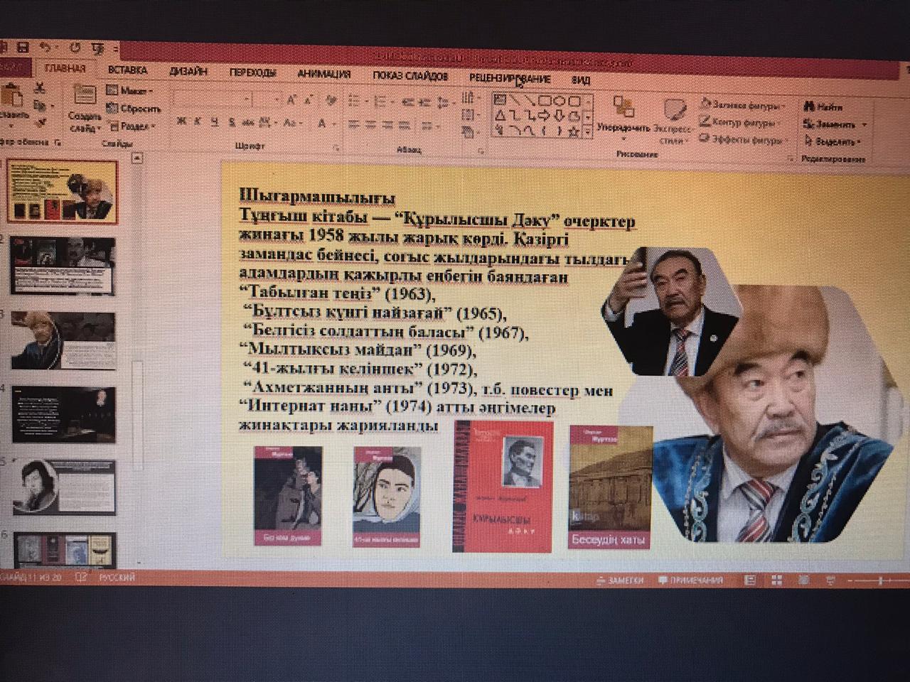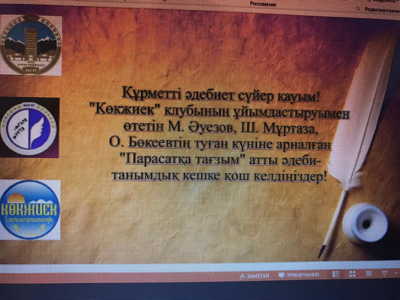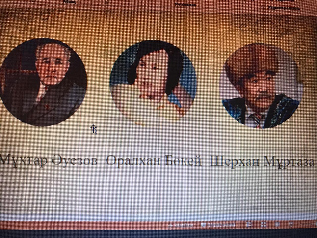 dedicated to the birthday of A. Auezov, Sh. Murtaza, O. Bokeyev. At this party in the format of on-line there took part the Master of Science, the senior teacher of the Department of the Kazakh and Russia Philology of the Eurasian Humanities Institute Rainbekov G.S. and the students of the 1st course of the educational programme “The Kazakh language and Literature’. In the course of the event the students analyzed the works of the writers and expressed their opinions. On behalf of EAGI the speeches were made by B.Muratbek, M.Toktarbekov and recited their poems.
