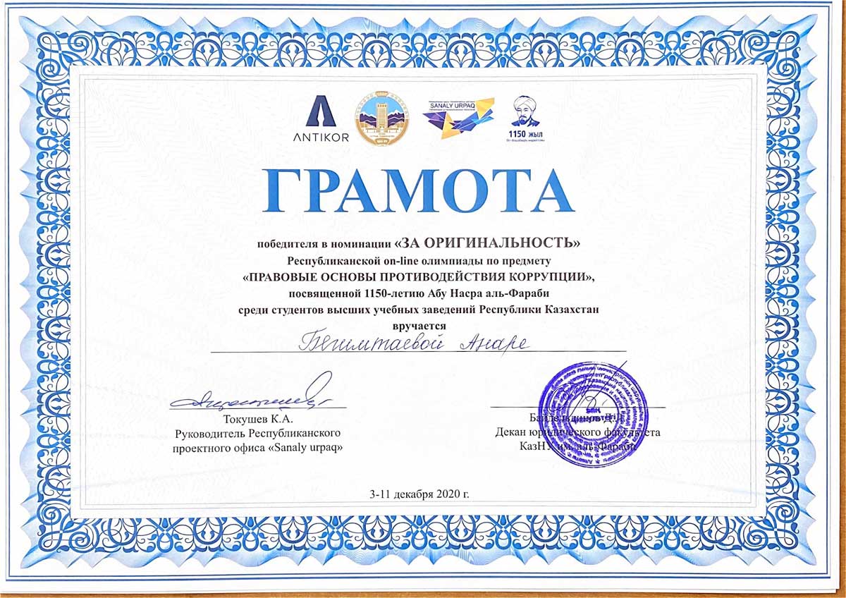 In December 2020 the students of the educational program 5В030100-«Jurisprudence» took part in the Republican on-line Olympiad devoted to the International Day of fighting against corruption on the discipline: “Legal basics of anti-corruption” among the students of higher educational establishments of the Republic of Kazakhstan. This Olympiad was held by the Kazakh national university named after Al-Farabi together with the Agency of RK on anti-corruption and the Republican project office «Sanaly urpaq».