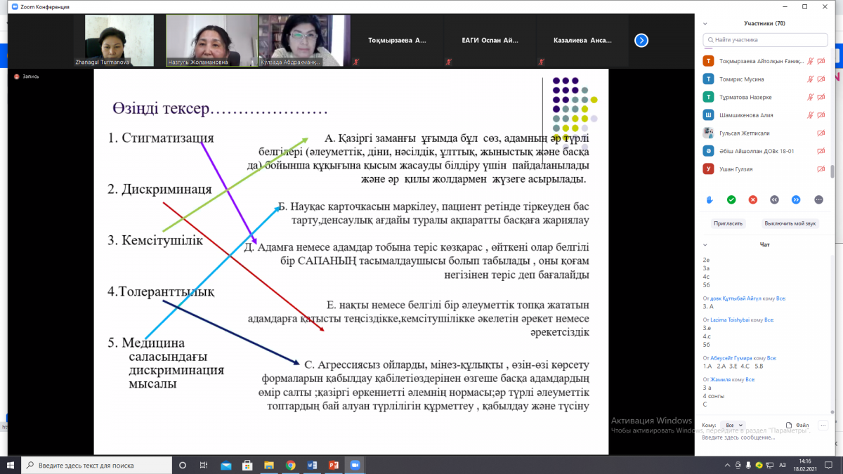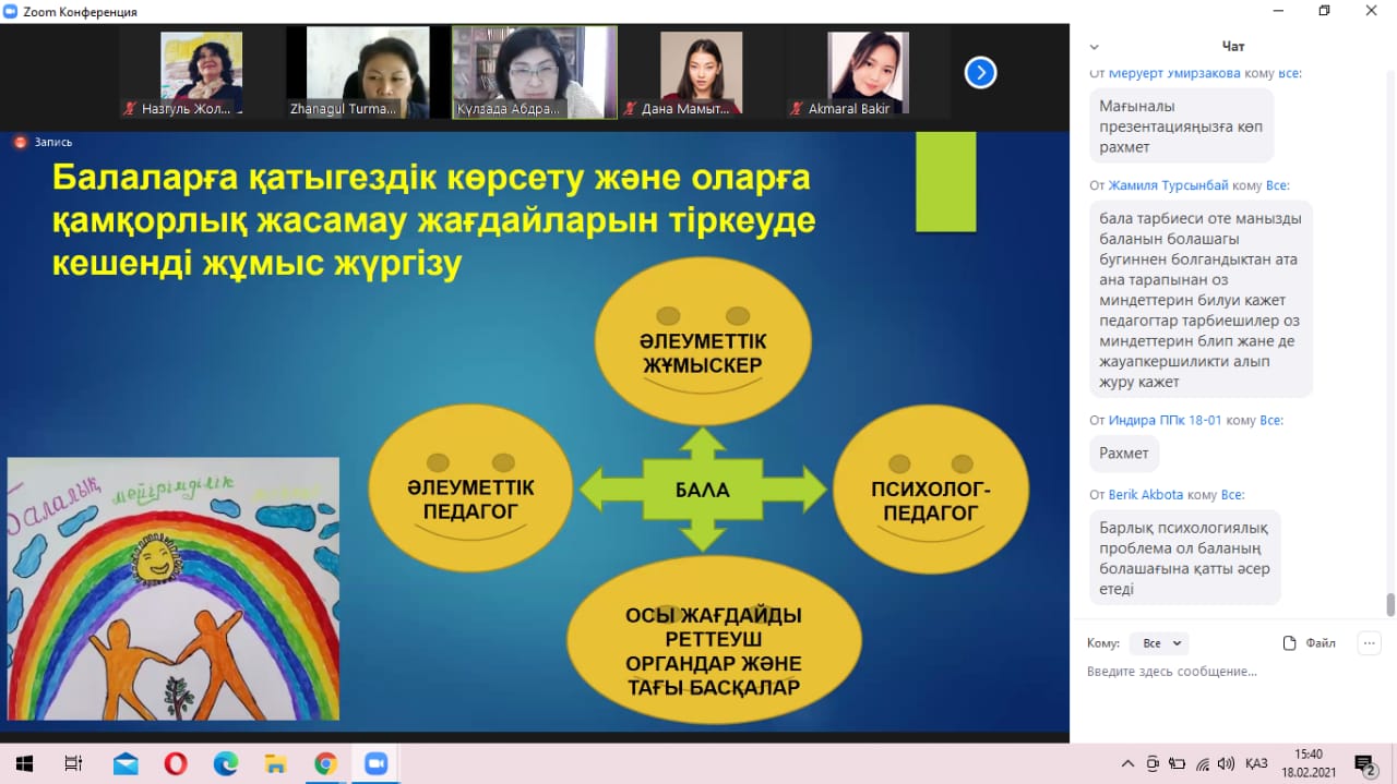 On 18 February 2021 on the basis of the given program Turmanova Zh.Ye. and Bolatbekova N.Zh. conducted the on-line seminar at the Republican level on the themes: “Protection children from violence”, “Stigma and overcoming discrimination”.The students of the educational programs of EAGI: “Pedagogy and Psychology”, “Pedagogy and Methods of Primary Teaching”, “Pedagogy of Pre-school education”, the students and the teaching staff of the educational program