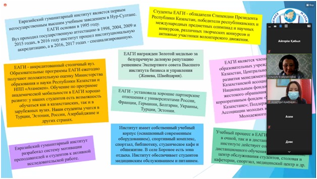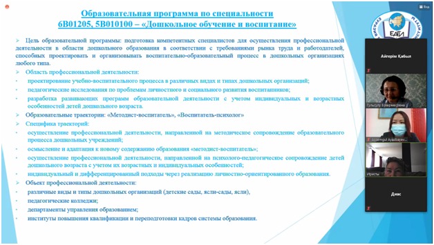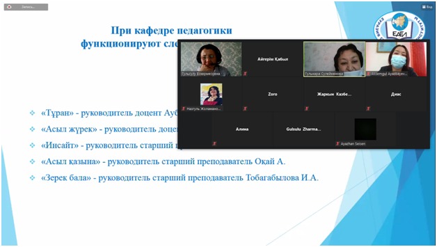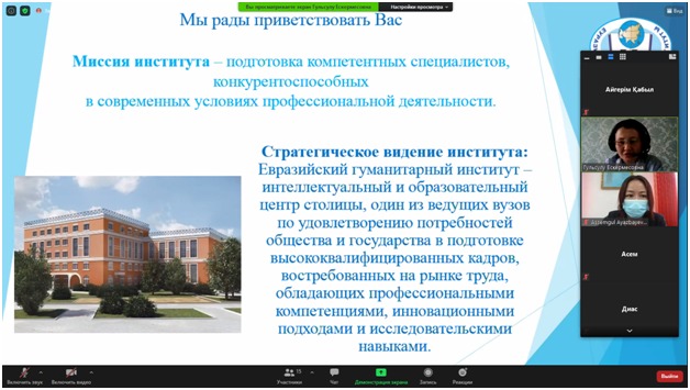 The career guidance on-line seminar was opened by the Deputy Head of the Department of Pedagogy, Docent Ayazbayeva A.T. The teaching staff of the Department: Docent Suleymenova G.B., the senior teachers: Tobagabylova I.A., Bolatbekova N.Zh. gave the graduates of 2021 full information about each specialty of the Eurasian Humanities Institute. The activity of the student clubs, functioning at the Department of Pedagogy: «Асыл жүрек», «Инсайт», «Зерек бала» was covered in detail.