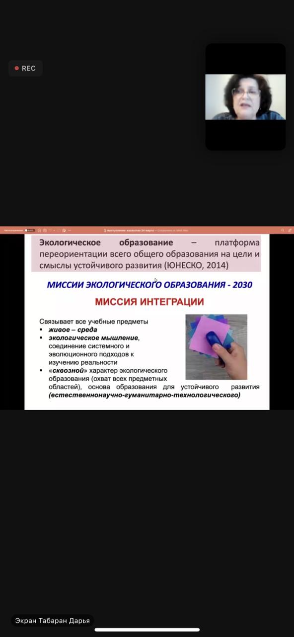 On March 24, 2023 Vice-Rector for Educational Affairs, Professor Ospanova Ya.N., Doctor of Philosophy (PhD), Docent of the Department of Foreign Languages Ospanova Zh.T., member of the EAGI Alumni Association, postgraduate student of Moscow State University named after M.V. Lomonosov Akimish D. took part in webinar on the topic: “Designing the content of environmental education in “green” school: problems and solutions” within the framework of the IRN project AP14869631 “Model” green school – green college – green university “as a system for the development of green education” . The speaker was international expert in environmental education, Doctor of Biological Sciences, Professor, VNS of the Laboratory of Didactics and Philosophy of Education, Head of the UNESCO Network Chair Dzyatkovskaya E.N.