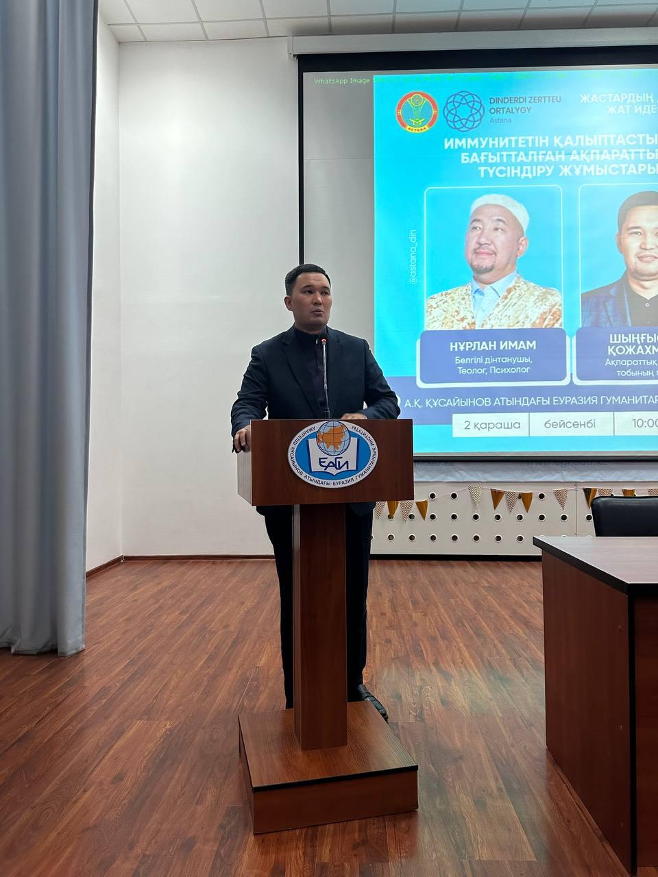 On November 2, 2023, information and explanatory meeting of a new format of representatives of the Center for the Study of Religions: the chief imam of the Yryskeldi Kazhy mosque Asanov Nurlan Baizhigitovich, a member of the information and explanatory group in the field of religion in Astana Kozhakhmetov Chingis Khan was held with students of the A.K. Kussayinov Eurasian Humanities Institute. It was aimed at building the immunity of youth to unconventional ideology.