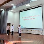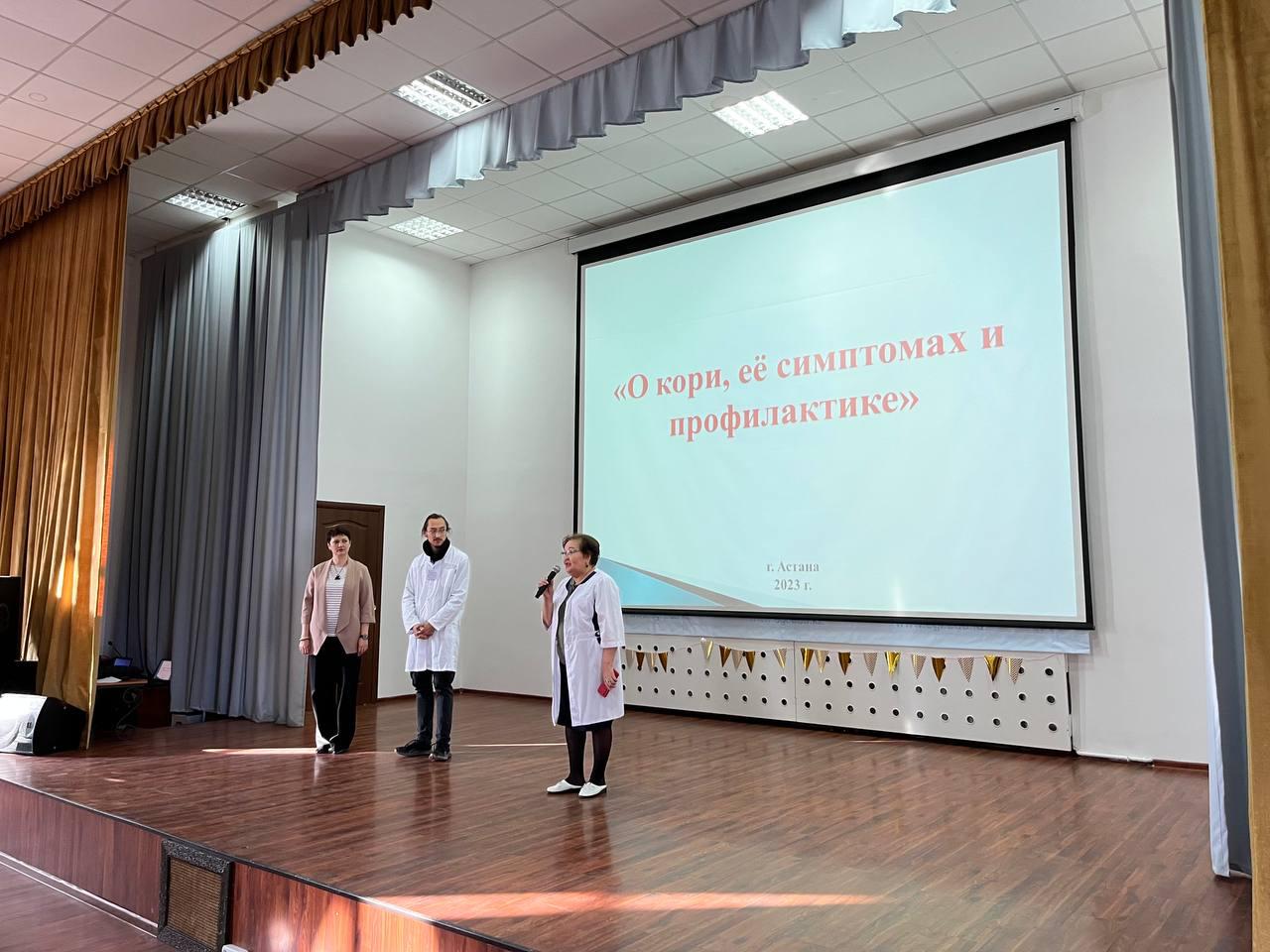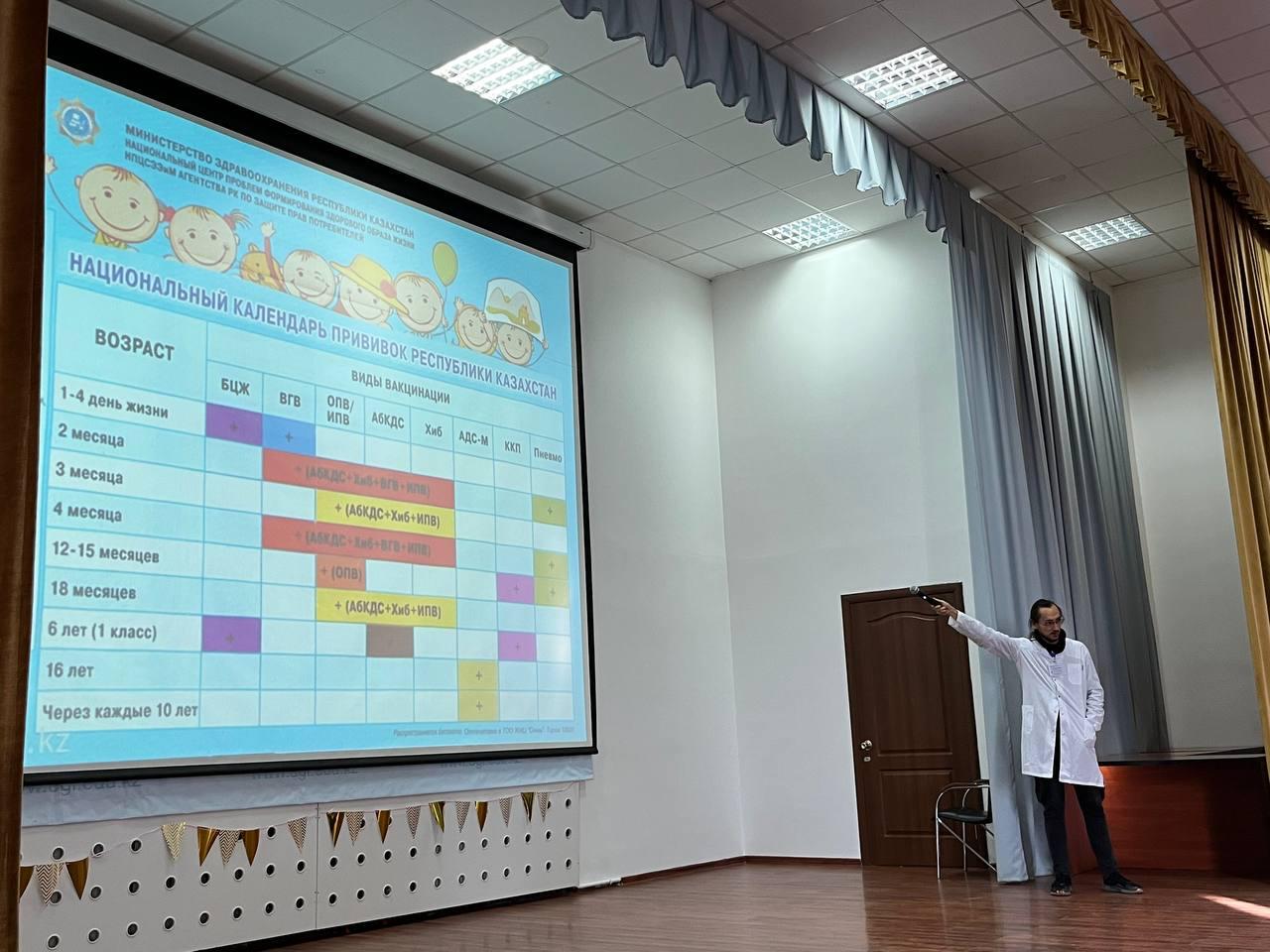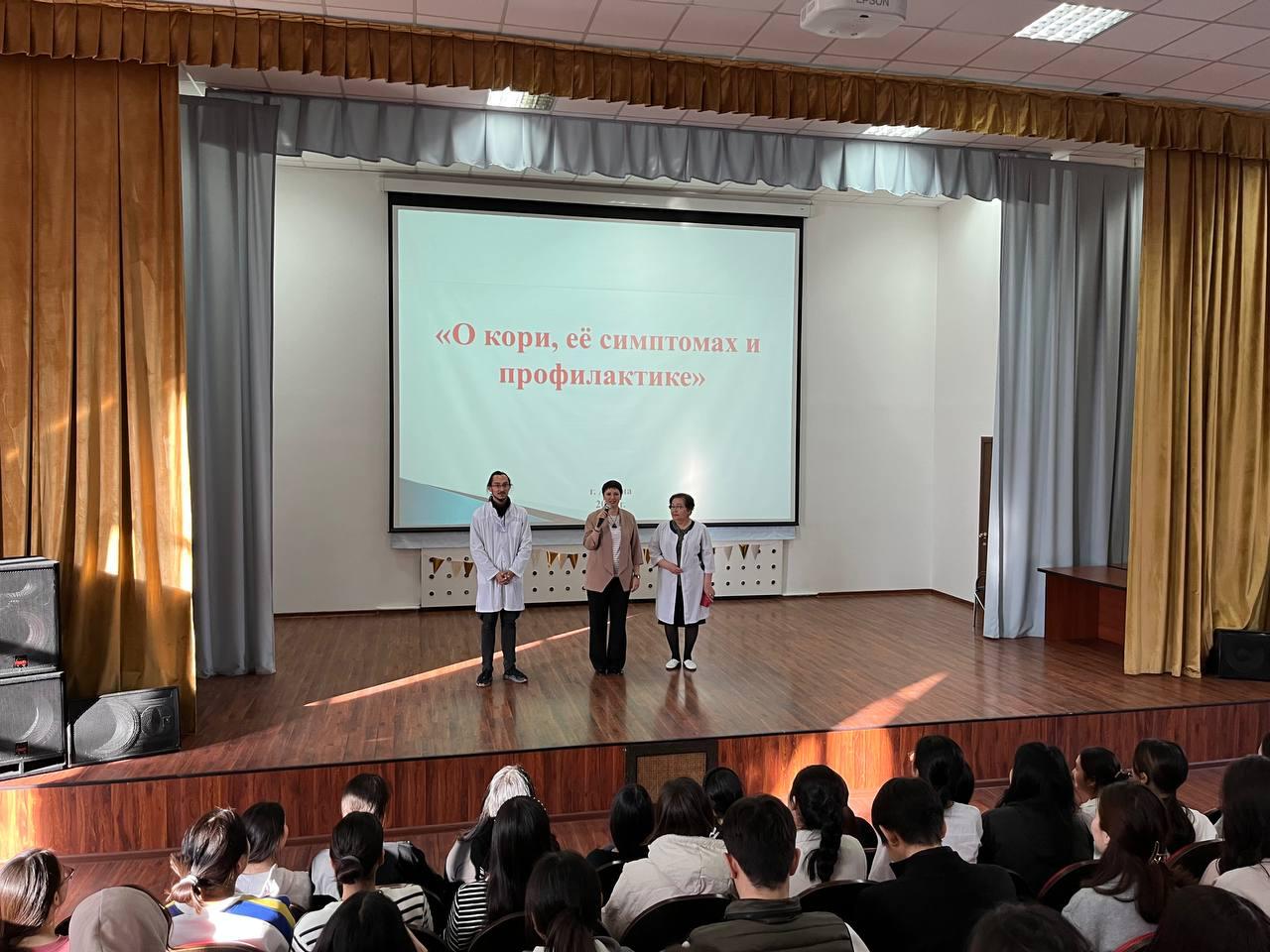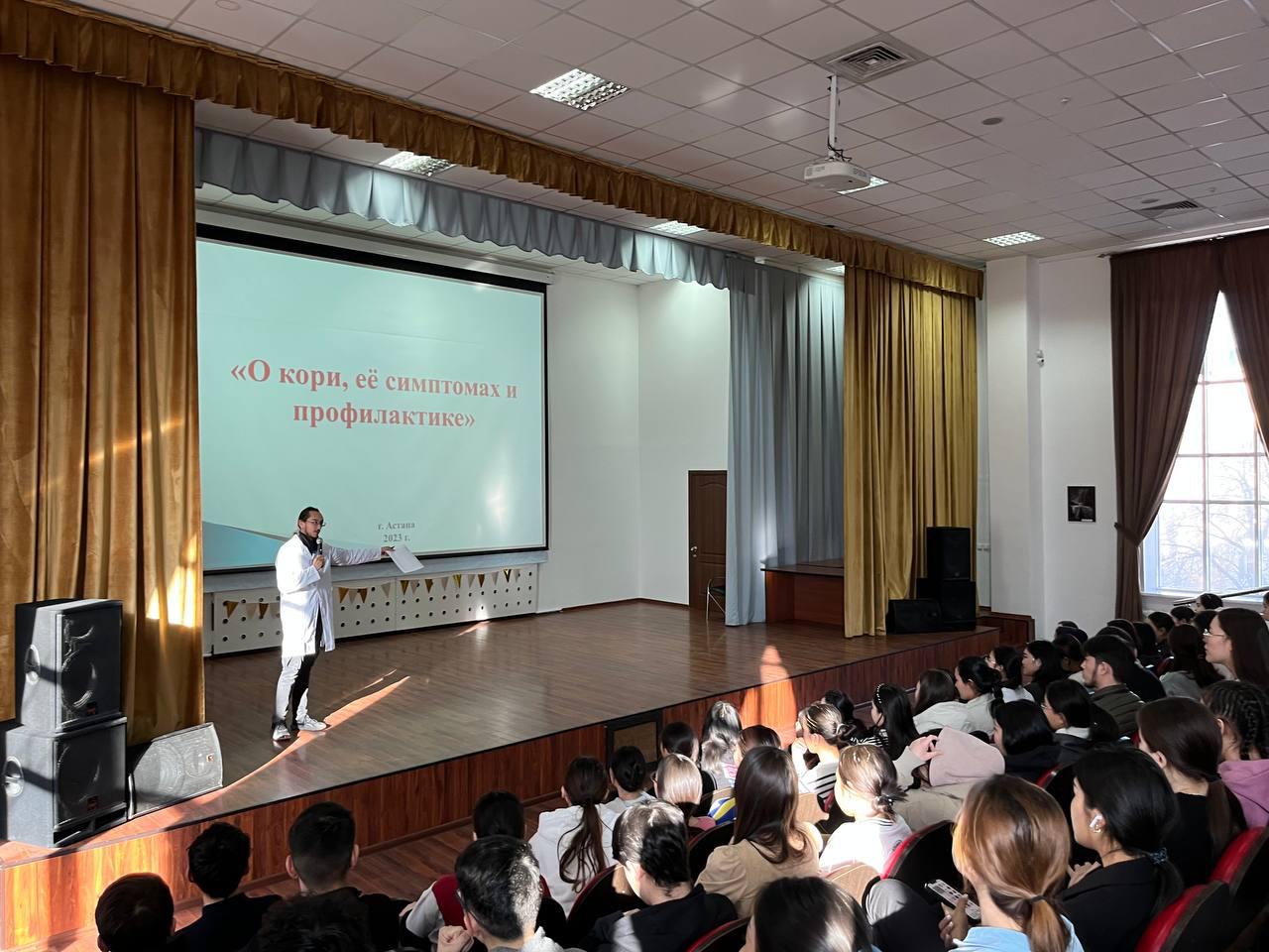 On November 7, 2023, infectious disease doctor of the State Public Enterprise “City Clinic No. 3” of the Akimat of Astana city A. Nurmaganbetov gave lecture for students living in the dormitory on the topic: “Measles Prevention.” The issues of complications and prevention of this infectious disease were covered.