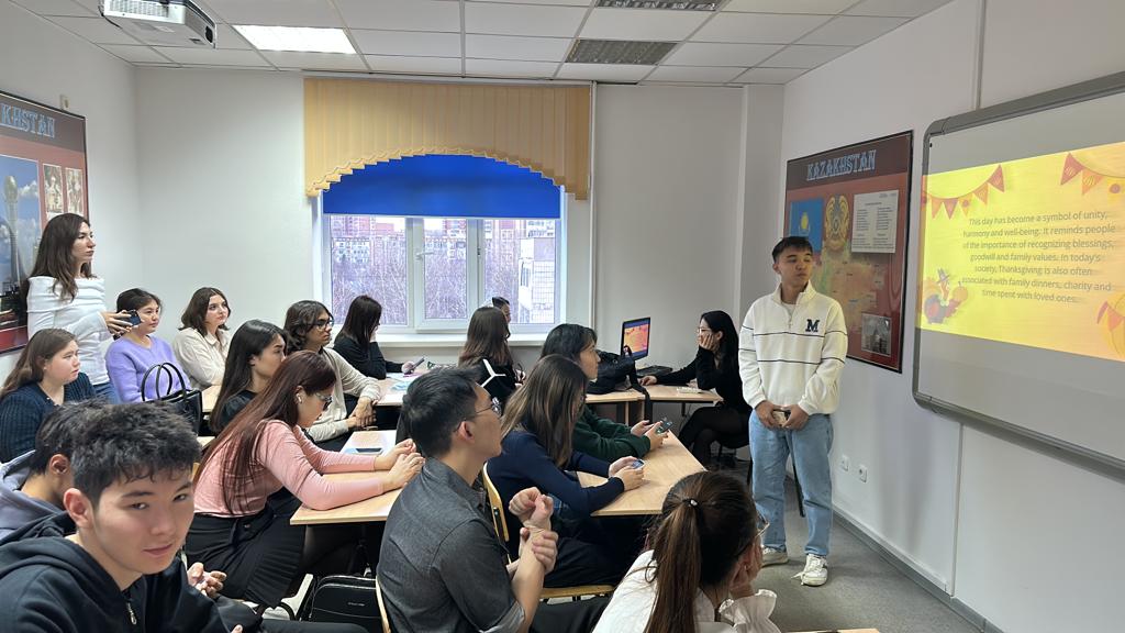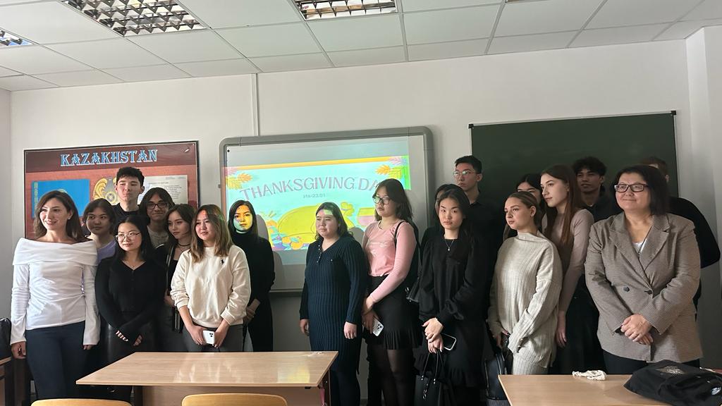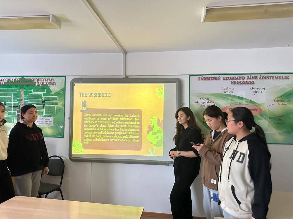 On November 22, 2023 senior teachers of the Department of Foreign Languages Sarsenova A.M., Tolkimbekova A.E., Siryachenko V.V. conducted a thematic curatorial hour for students of academic groups ShT-22-01, IyA-23-01 (1-2 years, educational program “Foreign Language: Two Foreign Languages”), dedicated to introducing one of the US public holidays, Thanksgiving Day.