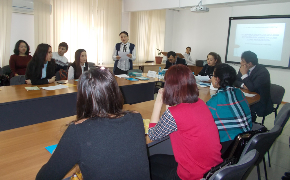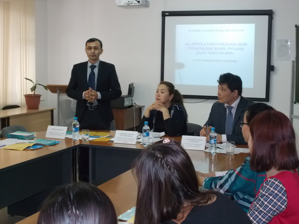 Үстіміздегі жылдың 24 ақпан күні Педагогика кафедрасының ұйымдастыруымен және 1 курс студенттерінің қатысуымен «Қазіргі Қазақстандағы діни тұрақтылық және рухани даму мәселелері»  атты тақырыптағы семинар өткізілді. Семинарға Астана қаласы әкімдігі Дін мәселелерін зерттеу орталығының «Деструктивті діни ағымдардан зардап шеккендерге көмек беру» бөлімінің басшысы Л.Қ.Қойшиева және философия ғылымдарының кандидаты, дінтанушы ғалым К.Тышхан, педагогика ғылымдарының докторы, профессор Б.С.Сарсекеев қатысты. Семинар барысында  еліміздегі мемлекеттік діни саясат, діни тұрақтылық мәселесі талқыланып, жастардың діни сауаттылығын арттыру мәселесі көтерілді. Студенттерге Дін мәселелерін зерттеу орталығының арнайы дайындалған буклеттері, брошюра және ақпараттық материалдары таратылды.