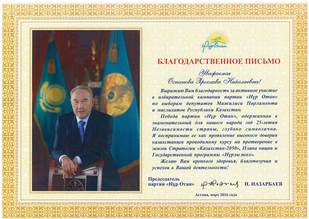 ЕАГИ-дің жастар ісі жөніндегі Комитеті "Нұр Отан" партиясынан алғыс хат алды