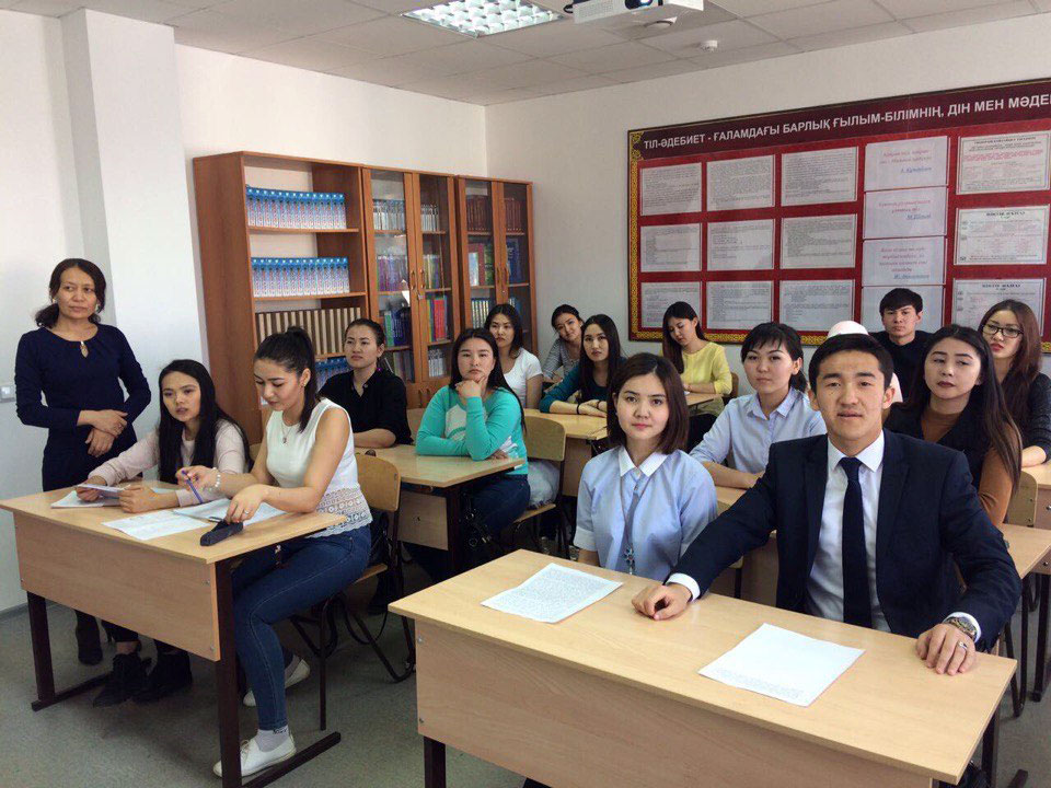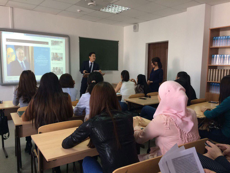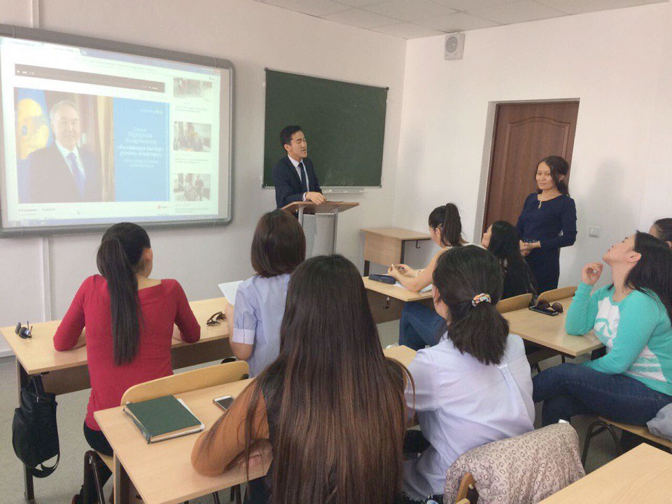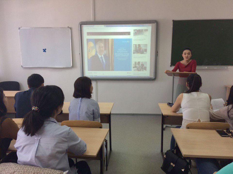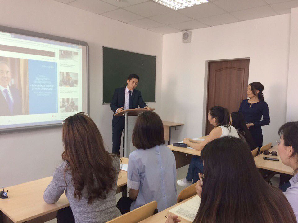 Сәуір айының 19-ы күні ҚТӘ-14-01 және ҚТӘ-14-02 тобы студенттерінің арасында Елбасы Н.Ә. Назарбаевтың «Болашаққа бағдар: рухани жаңғыру» атты мақаласы аясында  кураторлық сағат өтіп, топ кураторлары ф.ғ.м., аға оқытушы А.Қ. Нұрбанова мен п.ғ.м., аға оқытушы А.Е. Әлімбаев өз ойларын білдірді. Студенттер Қуанова Набат пен Оразов Жомарт мазмұнды баяндама жасап, өз сөздерін қорытындылай келе, бұл мақалада қоғамдық-саяси және мәдени-ағартушылық бағыттағы маңызды жобаларға қатысты қабылданар нақты қадамдар көрсетілгендігін, бұлардың әрбіріне үлкен жауапкершілікпен қарау қажеттігін айтты.
