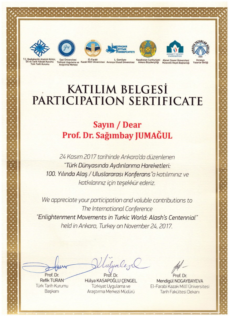 Үстіміздегі жылдың қазан айында қазақ және орыс филологиясы кафедрасының профессоры, филология ғылымдарының докторы Сағымбай Ботпайұлы Жұмағұлов Анкара қаласындағы Ғази Университетінің ұйымдастыруымен Алашорда үкіметінің 100 жылдығына арналған халықаралық ғылыми конференцияда «Алаш партиясына арналған өлеңдер» тақырыбында баяндама жасады.