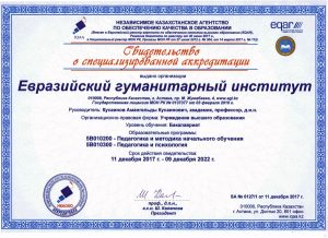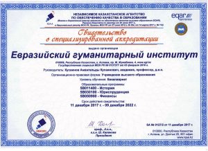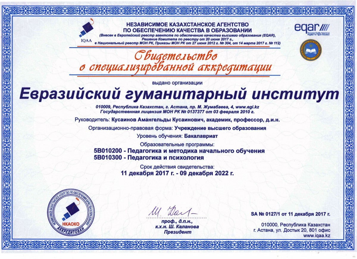 Білім беру сапасын қамтамасыздандыру тәуелсіз қазақстандық агенттігінің Аккредитациялық кеңесінің 2017 жылғы 9 желтоқсандағы шешімімен Еуразия гуманитарлық институты мамандандырылған аккредиттеуден 5 жыл мерзімге өткен болып танылды.