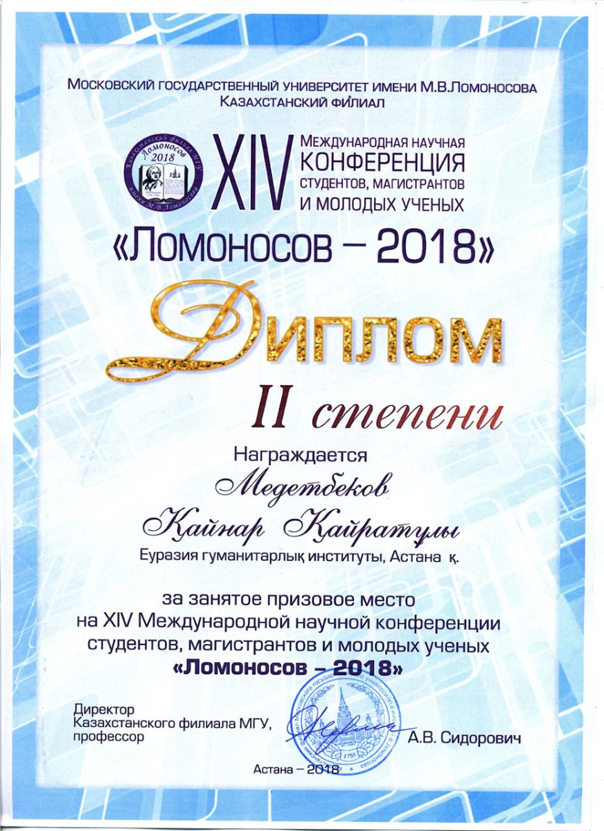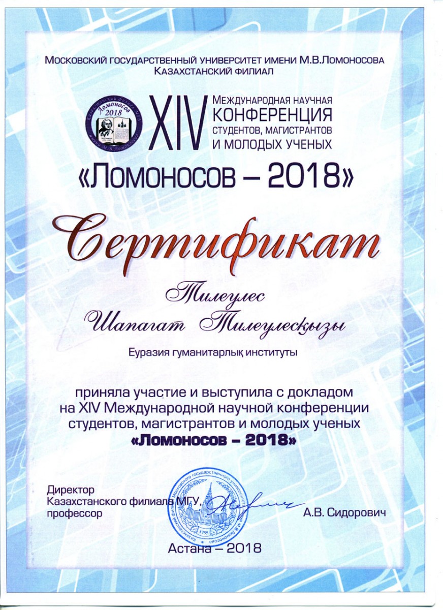 Сәуір айының 20-21 күндері М.В.Ломоносов атындағы Мәскеу мемлекеттік университетінің Қазақстандағы филиалының ұйымдастыруымен өткен студенттер мен магистранттардың және жас ғалымдардың ХІҮ Халықаралық ғылыми конференциясына институтымыздың «Қазақ тілі мен әдебиеті» мамандығының студенттері қатысты. Конференция нәтижесі бойынша ҚТӘ-15-01 тобының студенті Қ.Қ. Медетбеков жүлделі екінші орынды иеленіп (ғылыми жетекшісі: п.ғ.м., аға оқытушы А.Е. Алимбаев), ҚТӘ-15-01 тобының студенті Ш. Тілеулес баяндама жасап, белсенді қатысқаны үшін сертификатпен марапатталды (ғылыми жетекшісі: ф.ғ.к., доцент Л.Н. Дәуренбекова).