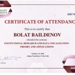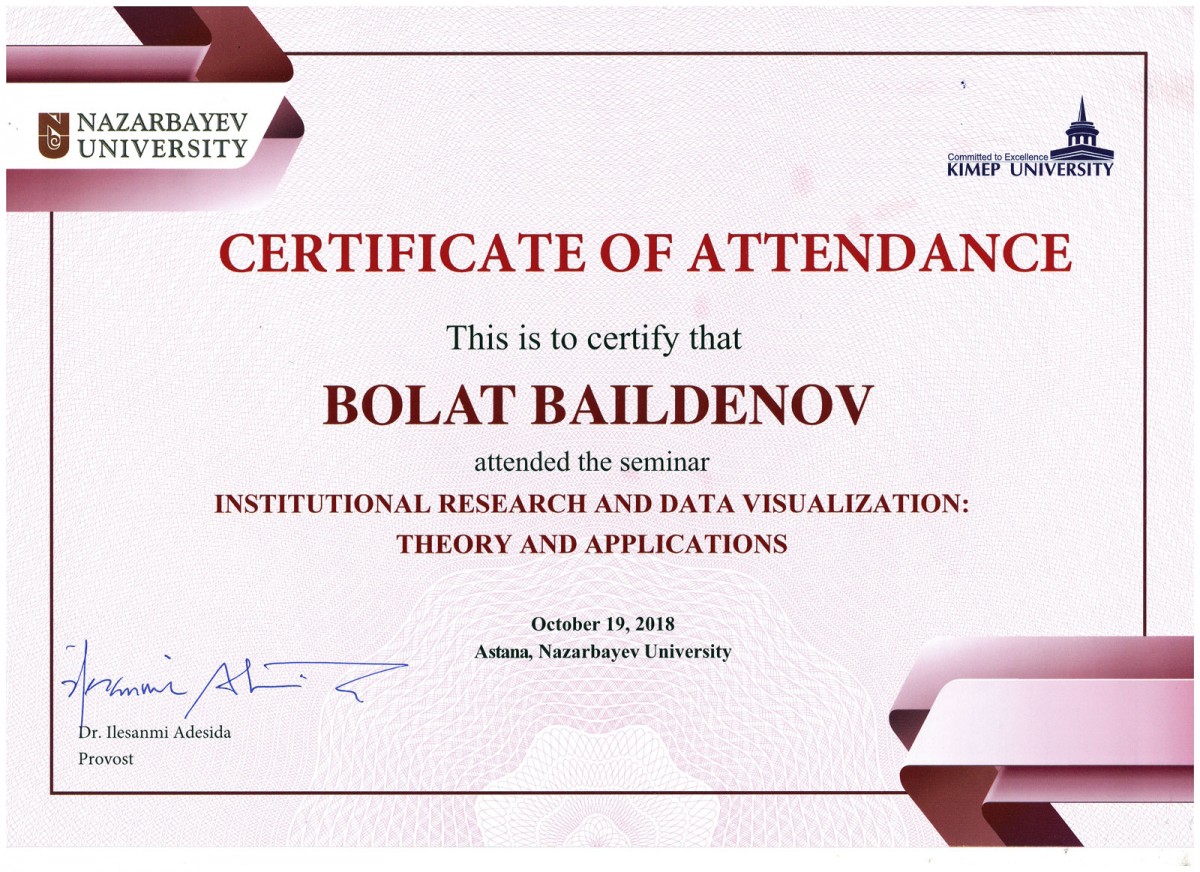 2018 жылдың 19 қазанында Назарбаев Университетінде өткен «Институционалдық зерттеулер мен мәліметтерді визуалдау: теориялық және практикалық аспектілер» семинарына ЕАГИ білім беру үдерісі сапасының мониторингі бөлімінің бастығы Б.Т. Байльденов қатысты. Семинарда жоғарғы оқу орындары дамуының стратегиялық бағыттарын анықтау мәселелерінде институционалдық зерттеулердің өзектілігі, институционалдық зерттеулер өрісінде компьютерлік бағдарламалар мен қосымшаларды практикада қолдану, сонымен қатар институционалдық зерттеулердің мақсаты, міндеттері және құрылымы талқыланды.