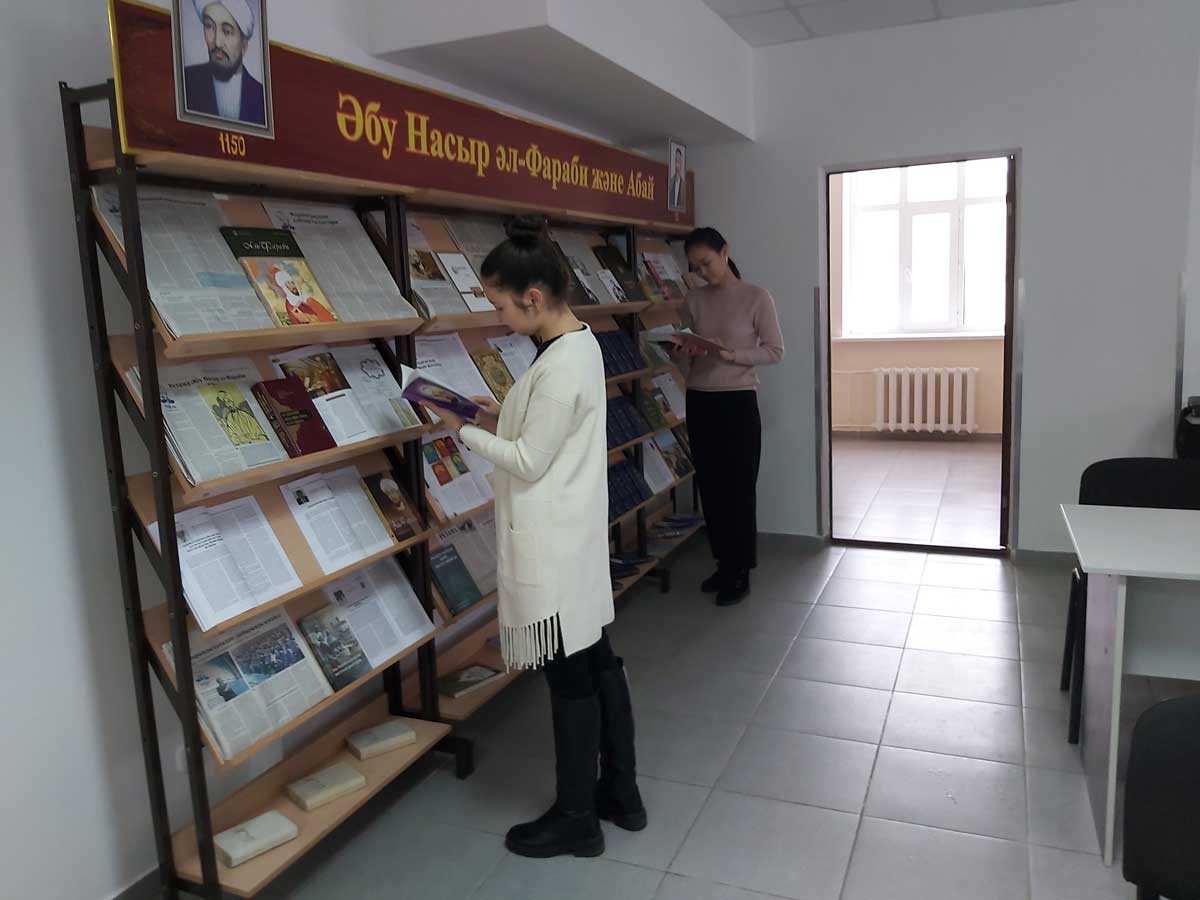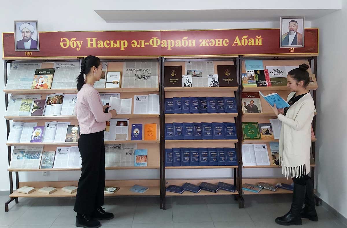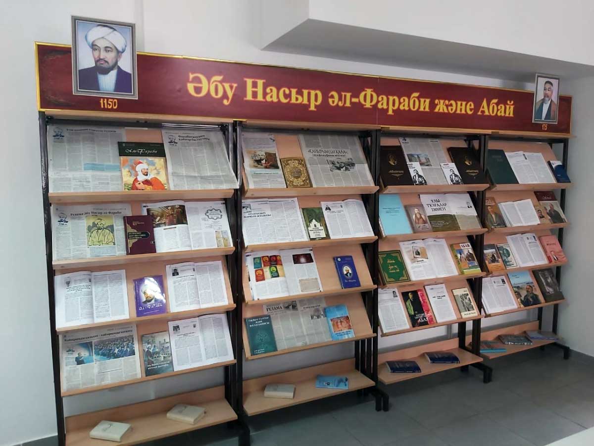 Кітапхана қорынан кітап көрмесіне данышпан-ғұлама Әбу Насыр әл-Фарабидің рухани келбетін ашатын зерттеулер қойылды; әлемдік қоғамдық-философиялық ойдың дамуындағы әл-Фарабидің маңыздылығы мен оның мәдениет тарихындағы орны туралы ғалымдардың (Гафуров Б.Г., Касымжанов А.Х. Әл-Фараби мәдениет тарихында; Касымжанов А.Х. әл-Фараби; Көбесов әл-Фараби мен Абайды қатарға оқығанда; Қожақ Ж.Ә. әл-Фараби; Құл-Мұхаммед М. Әл-Фараби. Тарих, тұлға, уақыт) пікірлері көрсетілді.