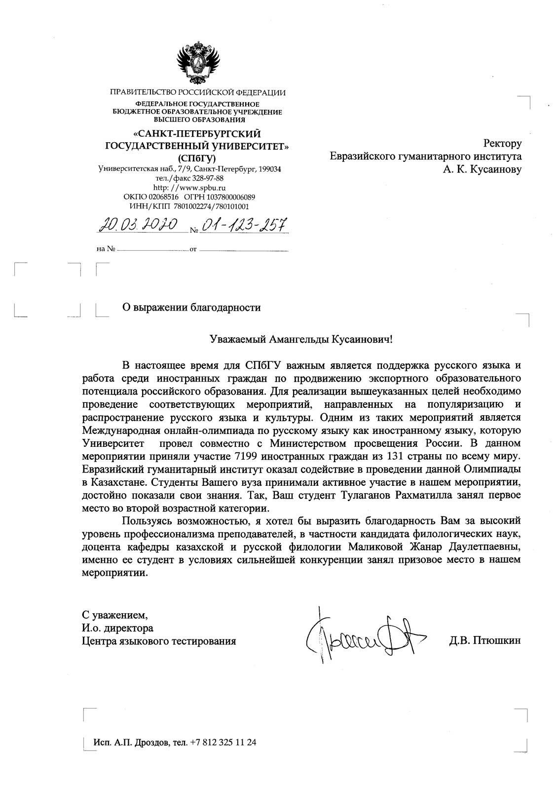 Санкт-Петербург мемлекеттік университетінен (СПБУ) ректорымыз Амангелді Құсайынұлының атына Алғыс хат келді, алды, онда Тілдерді тестілеу орталығының директоры Д.В. Птюшкин Ресейдің Білім министрлігімен бірлесіп өткізілген орыс тілі мен мәдениетін насихаттау бойынша халықаралық онлайн-олимпиаданы өткізуге көрсеткен көмегі үшін Еуразия гуманитарлық институтына ризашылығын білдірді.