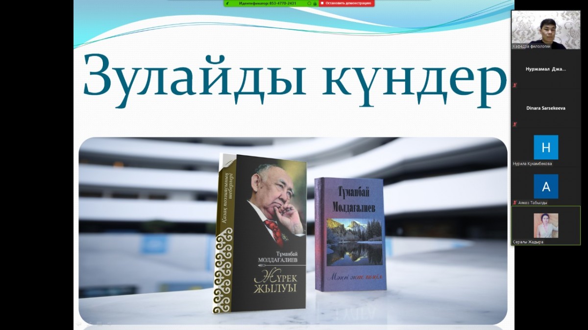 «Қазақ тілі мен әдебиеті» білім беру бағдарламасының 1 курс студенттеріне Т.Молдағалиевтің туғанына 85 жыл толуына орай «Зулайды күндер» тақырыбында онлайн кураторлық сағаты өтті. Топ кураторы, п.ғ.м., аға оқытушы А.Е. Алимбаев ақынның шығармашылығына тоқталып, қазақ әдебиетіндегі өлең жанрының маңызы жайлы сөз қозғады. Топ студенті Жадыра Сералы ақынның өмірі мен шығармашылық жолынан кеңінен ақпарат айтып, ақынның ән мәтіндерін талдады.