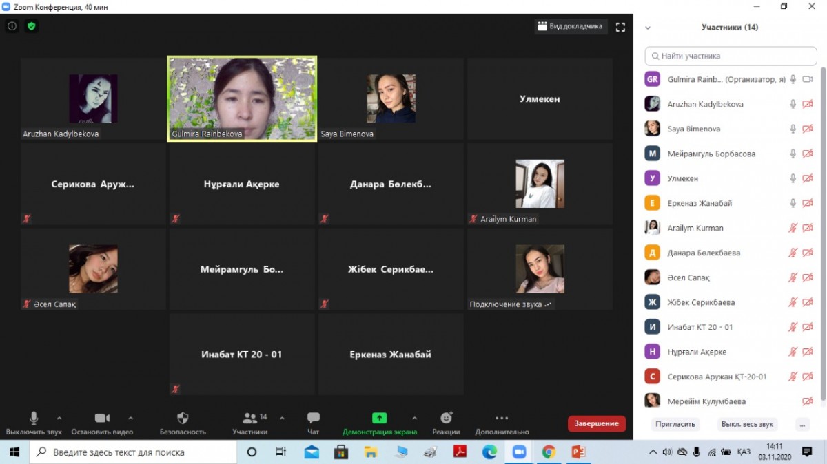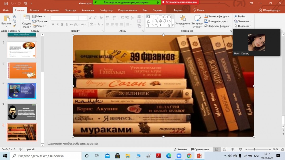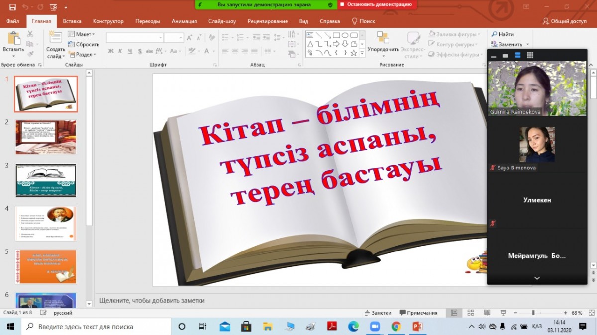 2020 жылдың 3 қараша күні қазақ және орыс филологиясы кафедрысының аға оқытушысы, ғылым магистрі Г.С. Райнбекова кураторлық ҚТ-20-01 тобының студенттерімен «Кітап – білім бастауы» тақырыбында дөңгелек үстел өткізілді. Дөңгелек үстел барысында оқытушы мен студенттер оқылған кітаптарды талқылап, пікір алмасты.