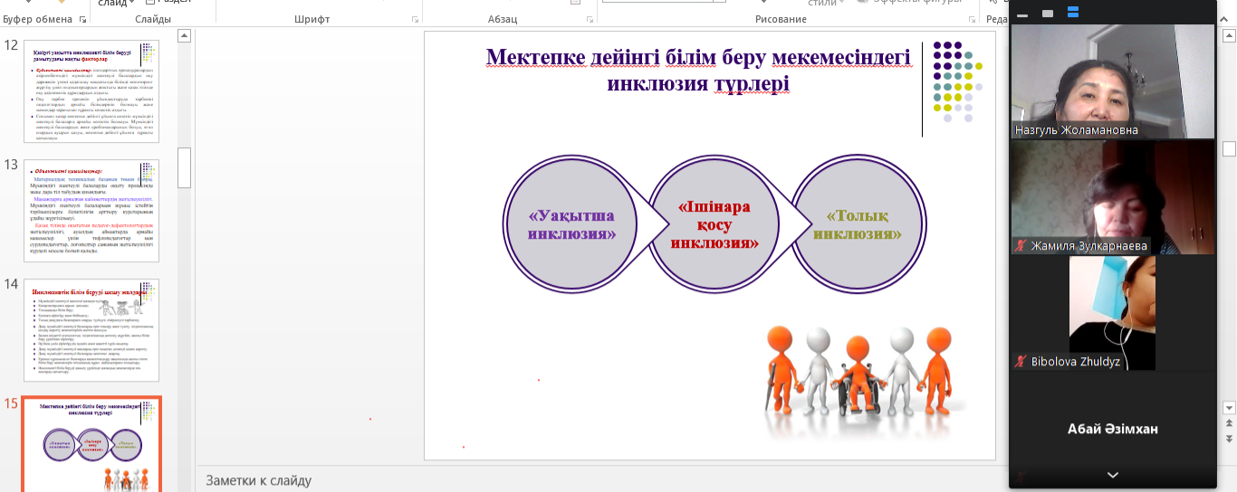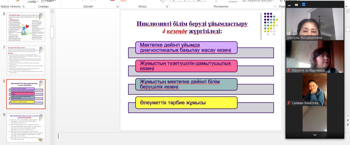 2020 жылдың 30 қараша күні педагогика кафедрасының аға оқытушысы Болатбекова Назгуль Жоламановна академиялық ұтқырлық аясында Ш.Уәлиханов атындағы  Көкшетау мемлекеттік университетінің «Мектепке дейінгі  оқыту және тәрбиелеу» білім беру бадарламасының топтарымен «Инклюзивтік білім беру жөніндегі құзыретті кадрларды дайындау» модулі негізінде кезекті онлайн-дәріс сабағын өткізді. Онлайн-сабақ диалогтық формада, рефлексиялық деңгейде өтті.
