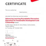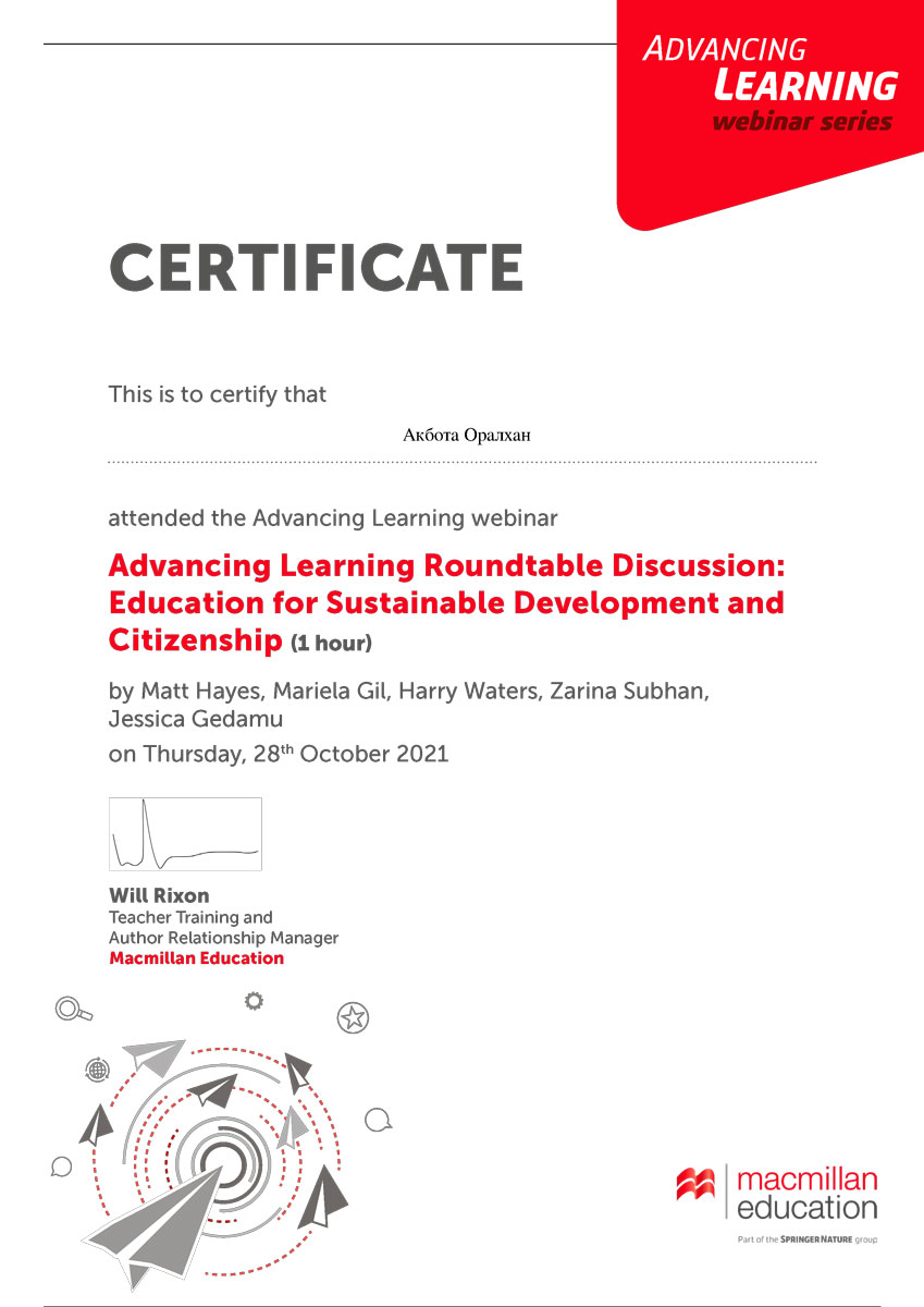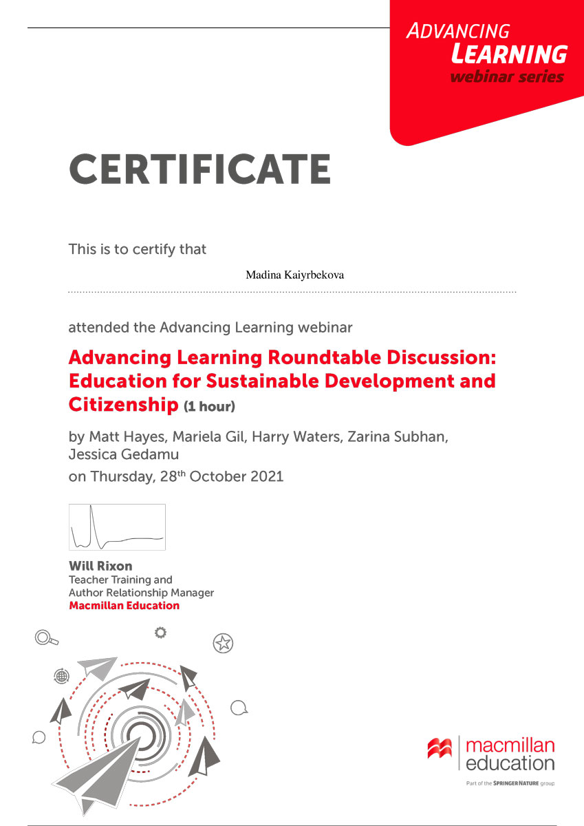 28 қазан күні шет тілдер кафедрасының аға оқытушысы, педагогика ғылымының магистрі Сарсенова Анар Мадибекқызы ИЯК18-02,ИЯК18-04,ИЯ18-01 топтарының студенттерімен бірге Macmillan Education өткізген”Advancing learning: education for sustainable development and citizenship”атты халықаралық дөңгелек үстелге қатысты. Дөңгелек үстел соңында қатысушыларға сертификаттар берілді.