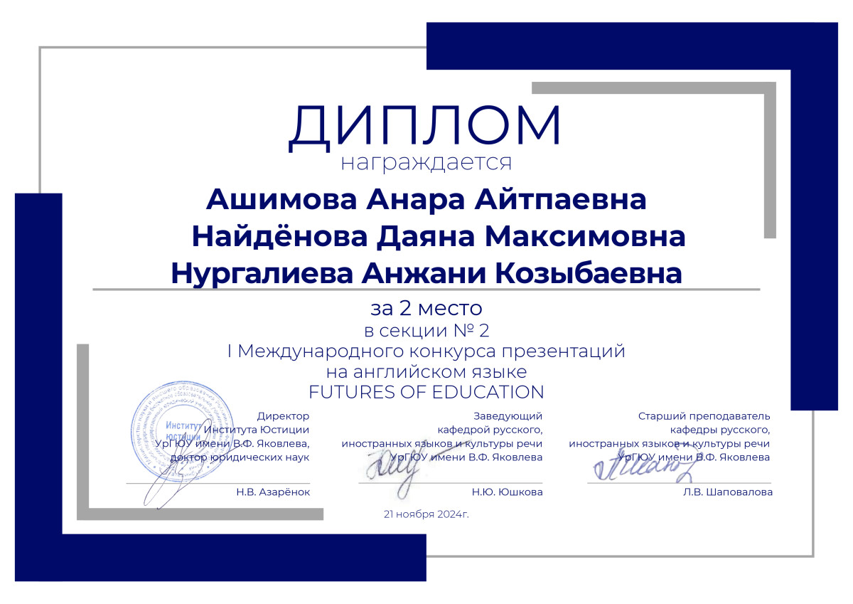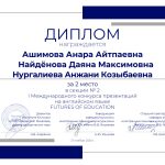 2-орын – Ашимова Анара Айтпаевна, Найдёнова Даяна Максимовна, Нургалиева Анжани Козыбаевна, А.Қ. Құсайынов атындағы Еуразия гуманитарлық институты, Астана қ. (ИЯ-22-01 академиялық тобы, 3-курс, «Шетел тілі: екі шетел тілі» білім беру бағдарламасы)