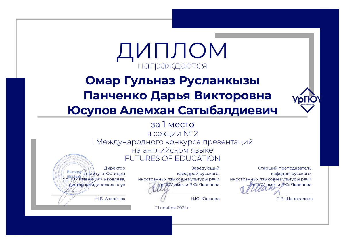 2024 жылғы 21 қарашада ағылшын тілінде «FUTURES OF EDUCATION» I Халықаралық презентация байқауы өтті. Байқауды Әділет институты мен В.Ф. Яковлев атындағы УрМЗУ орыс, шетел тілдері және сөйлеу мәдениеті кафедрасы ұйымдастырды.