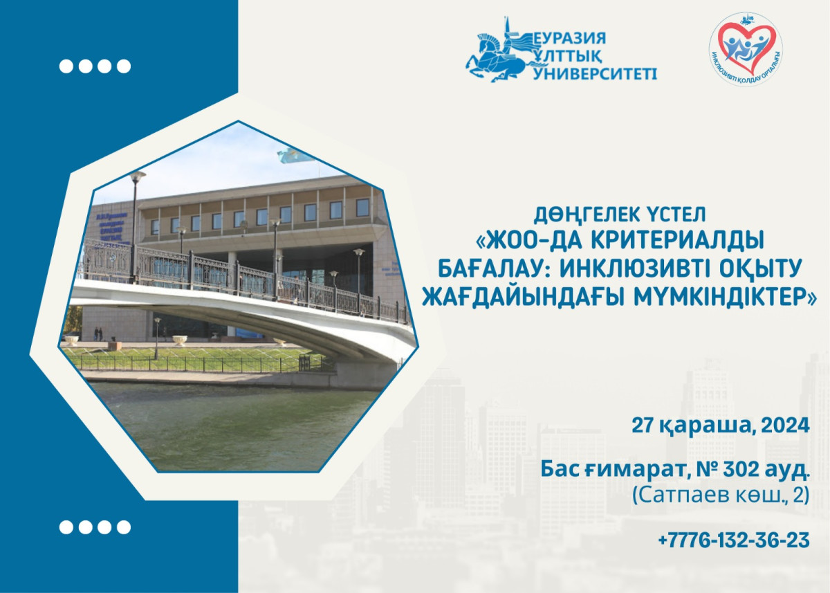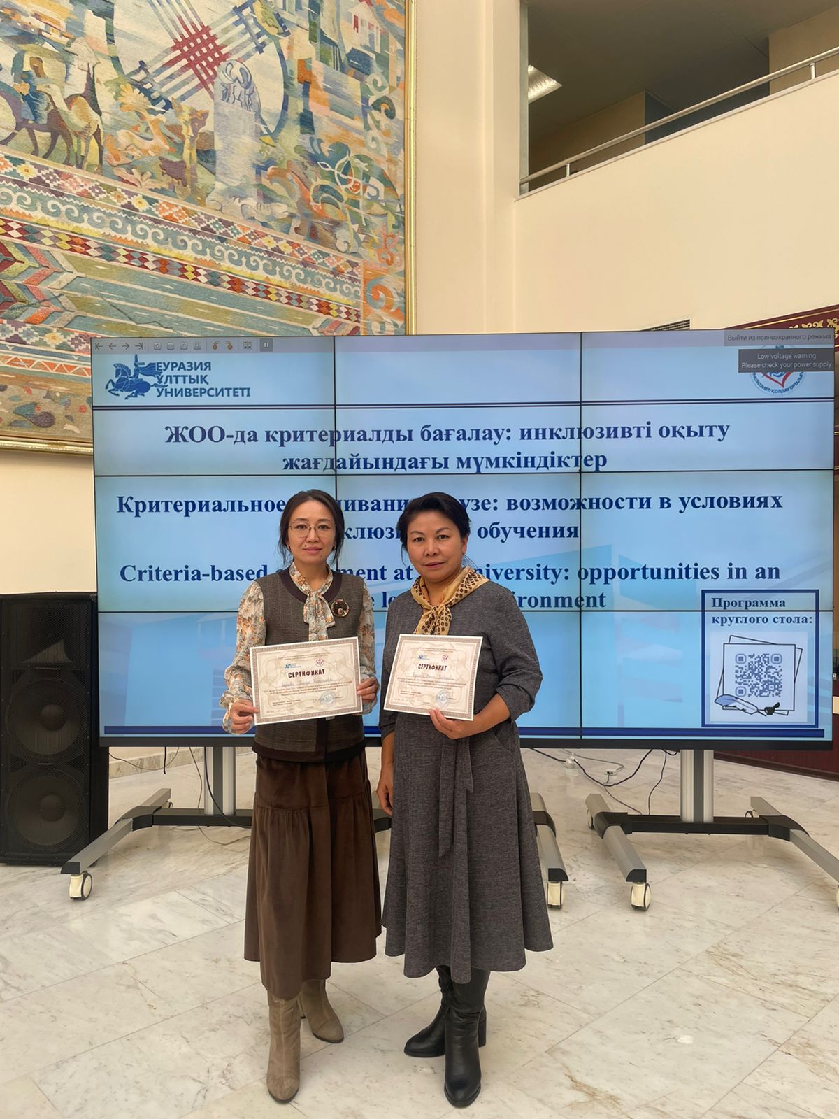 2024 жылдың 27 қарашасында, Л.Н. Гумилев атындағы ЕҰУ-дің Инклюзивті қолдау орталығы және Онлайн оқыту департаментінің ұйымдастыруымен «ЖОО-да критериалды бағалау: инклюзивті оқыту жағдайындағы мүмкіндіктер» тақырыбында дөңгелек үстел өтті. А.Қ. Құсайынов атындағы ЕАГИ-дің педагогика және тарих кафедрасының оқытушылары доцент Ж.Е. Турманова, PhD А.Т. Аязбаева қатысып, сертификат алды. Дөңгелек үстелде ЖОО ерекше білім беру қажеттіліктері бар білім алушылардың сапалы білім алуы мен кәсіби дайындығын бағалау мен бақылау бойынша маңызды сұрақтар талқыланды.