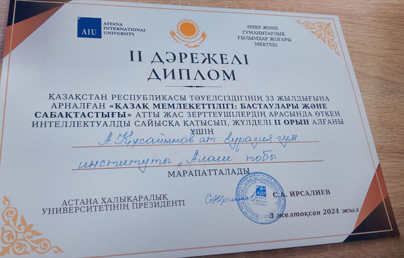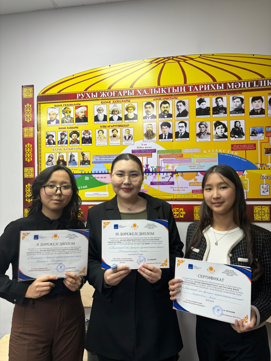 2024 жылғы 3-4 желтоқсанда педагогика және тарих кафедрасының аға оқытушысы А.З. Еслямованың жетекшілігімен «Тарих» білім беру бағдарламасының «Алаш» студенттер тобы (Тлеужан Бейбит – Т-22-01 академиялық тобы, Марекова Агия – академическая группа Т-23-01, Букенов Бекзат – Т-23-01 академиялық тобы) Астана Халықаралық университетінің базасында өткен «Қазақ мемлекеттілігі: Бастаулары мен сабақтастығы» тақырыбындағы жас зерттеушілердің зияткерлік байқауына қатысып, II дәрежелі дипломды иеленді.