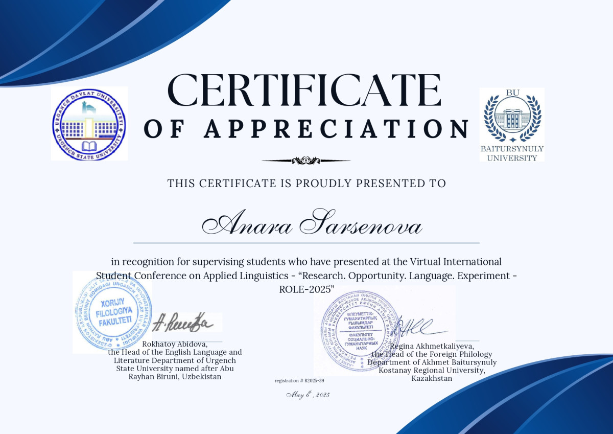2025 жылдың 6 мамырында «ROLE 2025: Research. Opportunity. Language. Experiment» қолданбалы лингвистика бойынша халықаралық студенттік конференция өтті. Қазақстан, Өзбекстан және Түркия оқу орындарының бакалавриат, магистратура және докторантура студенттері өз зерттеулерінің нәтижелерін қолданбалы лингвистика, тілдерді оқыту, медиадискурс, аударматану және т.б. бағыттарда ұсынды. Ұйымдастырушылар: А. Байтұрсынов атындағы Қостанай өңірлік университетінің шетел филологиясы кафедрасы (Қазақстан) және Абу Райхана Бируни атындағы Үргенч мемлекеттік университетінің ағылшын тілі мен әдебиеті кафедрасы (Өзбекстан) болды.