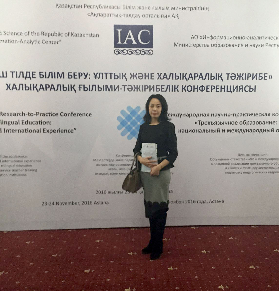 23-24 ноября 2016 года в Астане прошла Международная научно-практическая конференция «Трехъязычное образование: национальный и международный опыт», организованная АО “Информационно-аналитический центр” Министерства образования и науки Республики Казахстан. В конференции приняли участие эксперты-аналитики из Великобритании, Канады, США, Бельгии, Израиля, Китая и других стран, а также представители общественных организаций, преподаватели высших учебных заведений, в том числе и ЕАГИ. Участникам конференции была предоставлена возможность принять участие в работе 24 практических семинаров, на которых проходило обсуждение актуальных вопросов по трехъязычному образованию. В завершении конференции участникам были вручены сертификаты.