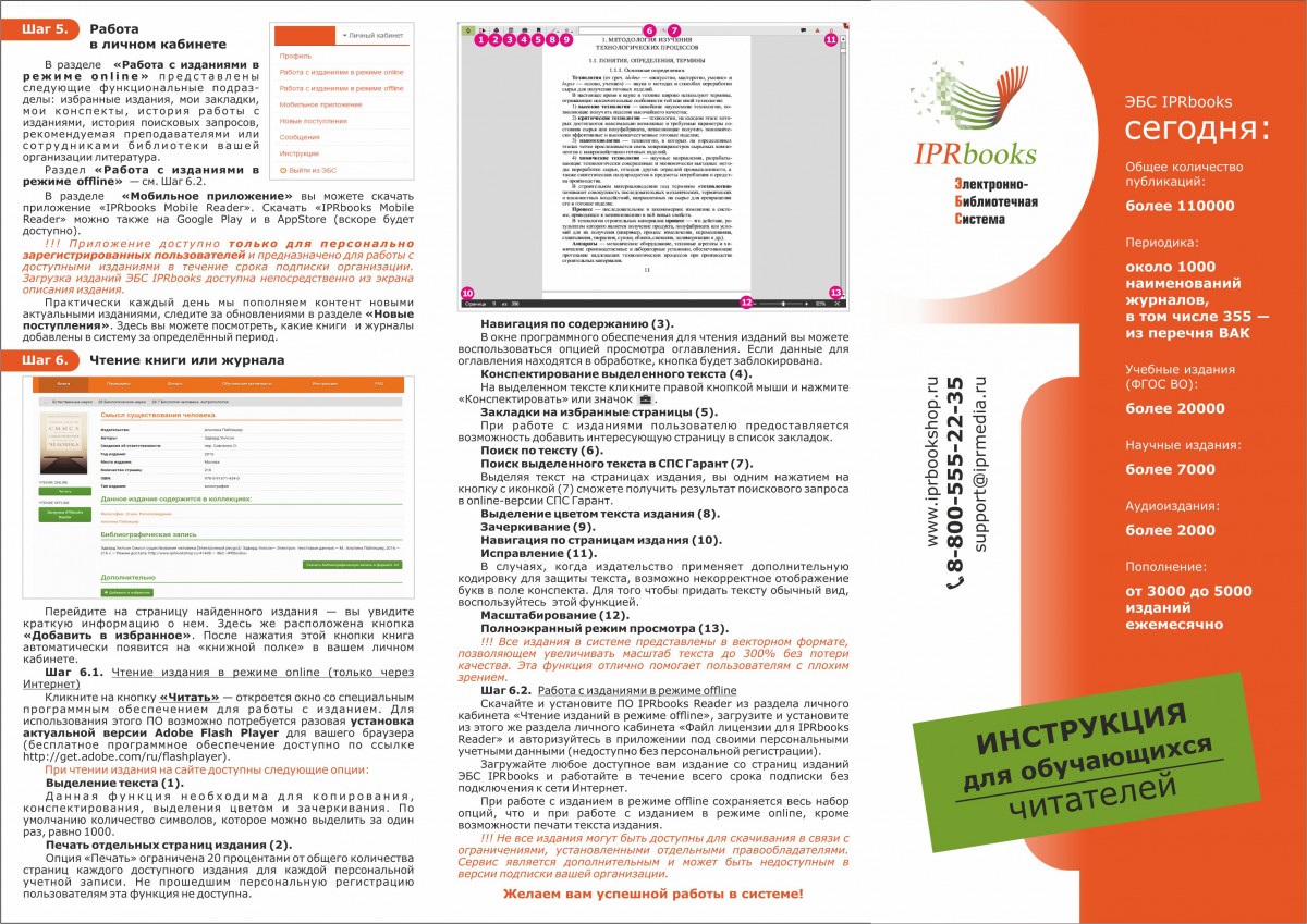 ЭБС IPRbooks — уникальный ресурс, объединяющий лицензионную учебную и научную литературу, периодические издания, аудиокниги, видеокурсы, он-лайн тесты по направлениям обучения, реализуемым в нашем учебном заведении. Общее количество публикаций на платформе сегодня составляет более 118 тысяч.