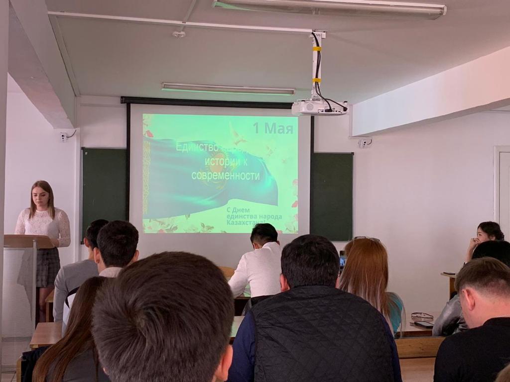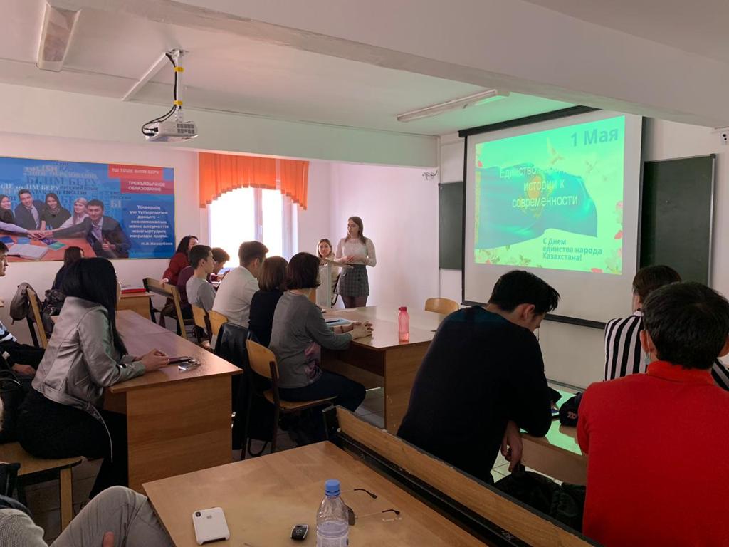 2 мая 2019 года в стенах Евразийского гуманитарного института на кафедре юридических дисциплин с участием групп ЮК-16-01, ЮР-18-01, ЮРС-18-01, ЮРС-17-01, ЮР-17-01, совместно с группой Ф-16-01 кафедры «Экономических и математических дисциплин» прошёл кураторский час, посвящённый Дню единства народов Казахстана. Основная цель данного мероприятия – сформировать между студентами дружеское взаимоотношение, способствовать воспитанию дружеских взаимоотношений межу людьми разных национальностей, прививать чувство уважения к обычаям, культуре и традиции своего государства.