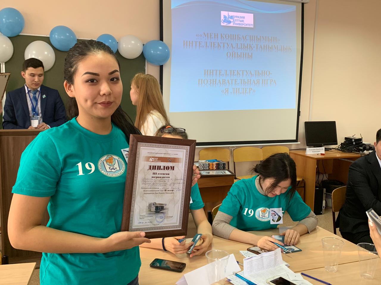 4 декабря 2019 года студенты кафедры «Экономических и математических дисциплин» приняли участие в Республиканской интеллектуально-познавательной игре «Я – лидер» в честь празднования Дня Первого Президента РК, проводимой ЕНУ им.Л.Н. Гумилева. Участниками игры были команды «Экономист» и «АРЕС» (ЕНУ им. Л.Н. Гумилева), «Мировики» (Казахский университет экономики, финансов и международной торговли), «The five and Team» (Атырауский гос. университет им. Х. Досмухамедова, г. Атырау), «Акулы бизнеса» (Евразийский гуманитарный институт), «The вest invest» (АО «Финансовая Академия»). По результатам игры наша команда «Акулы бизнеса» была награждена дипломом 3 степени. Руководителями команды были доцент Мажитова Б.Б. и ст.преп., магистр Дәулетханова Ж.Д.