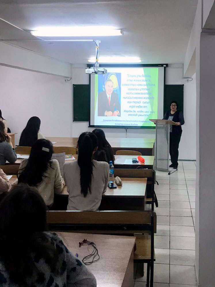 В группах ПДС-18-01 (куратор Сиренова Б.А.) и ИЯК-17-02 (куратор Умбетова К.Е.) были проведены кураторские часы, посвященные Дню Первого Президента Республики Казахстан. Студенты групп подготовили материал о роли Первого Президента Республики Казахстан Н.А. Назарбаева в становлении демократического государства. Студенты отметили особое отношение Елбасы к молодежи, которую он по-отечески называет «будущим страны».
