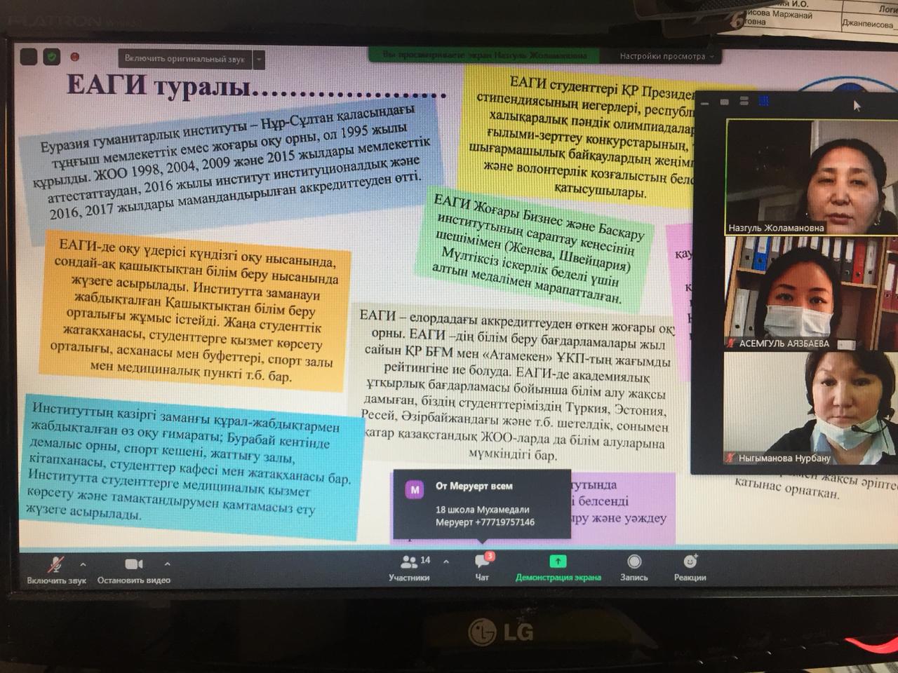 Под руководством старшего преподавателя Болатбековой Н.Ж. подробную информацию о каждой специальности кафедры педагогики Евразийского гуманитарного института предоставили выпускникам доценты Накипбекова Р.У., Сулейменова Г.Б., Аязбаева А.Т., преподаватели Окай А., Турманова Ж.Е., Жармаханова Г.Е. На вопросы выпускников ответила ответственный секретарь приемной комиссии института А.К. Жантаева.