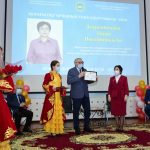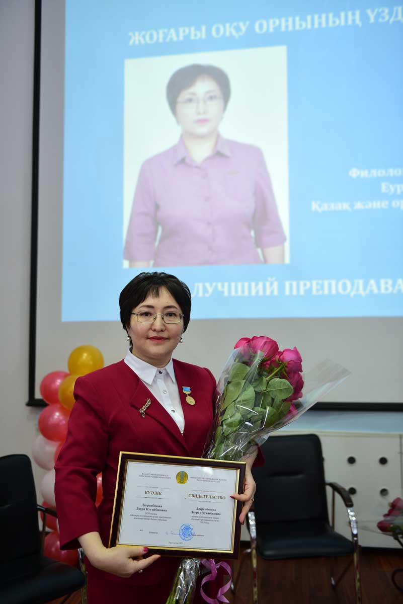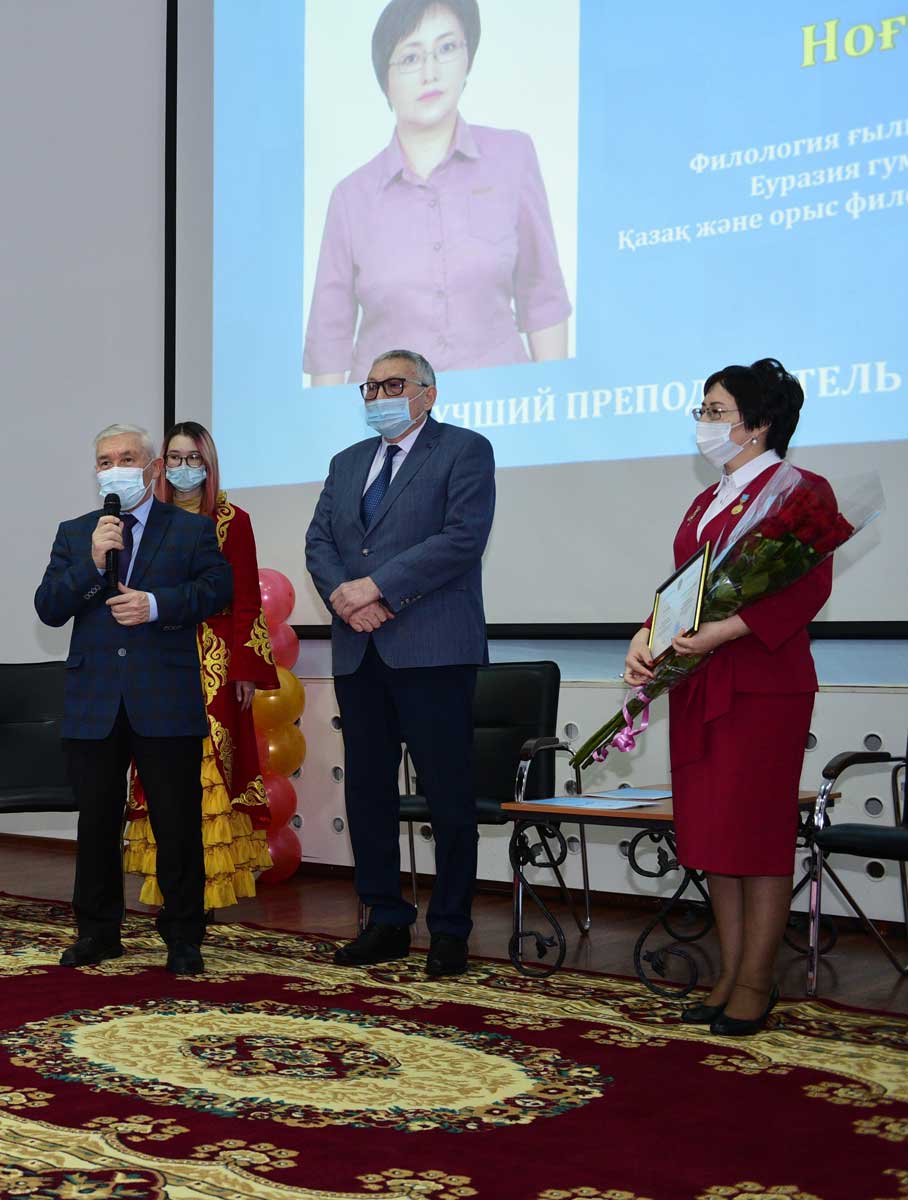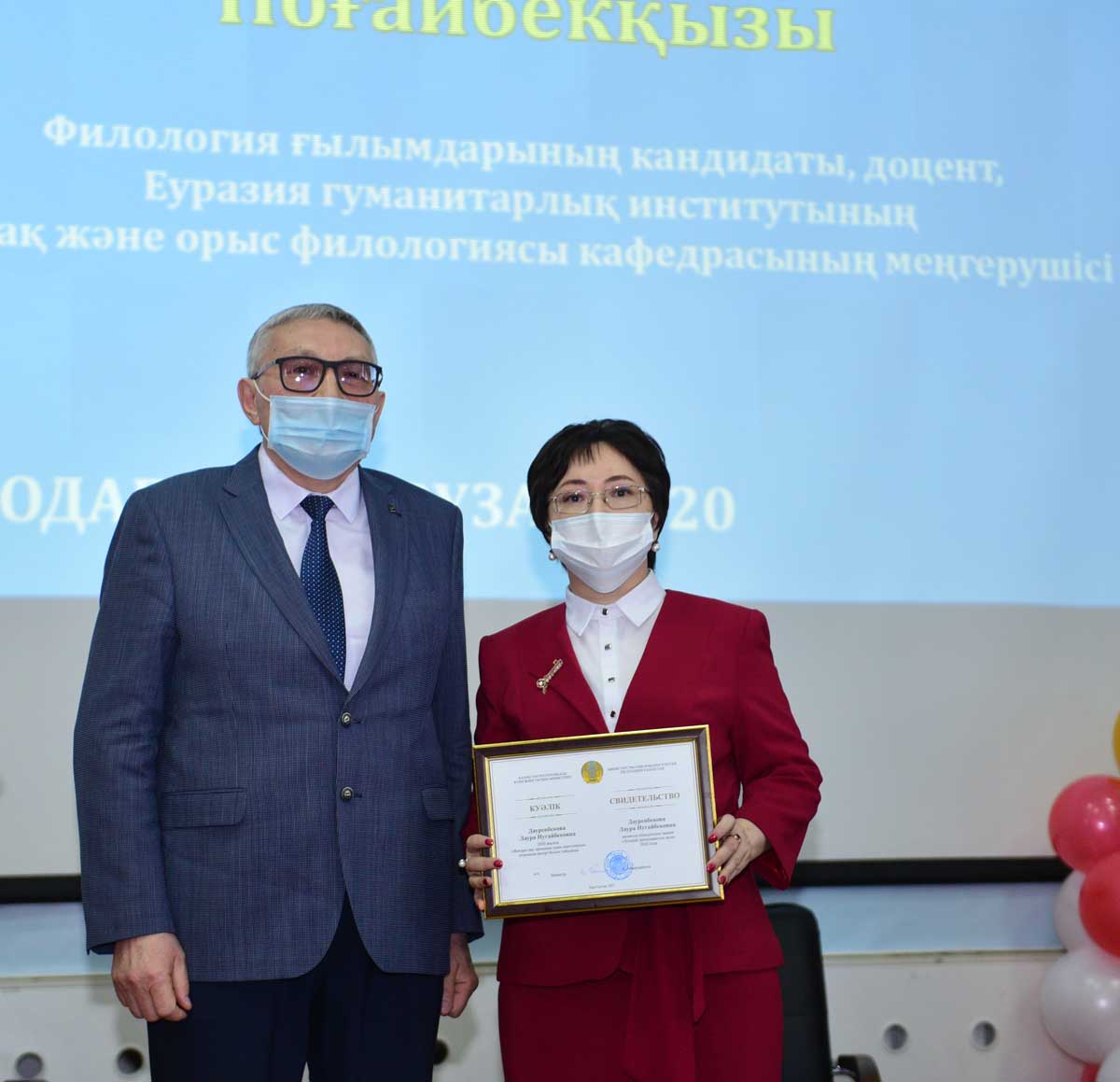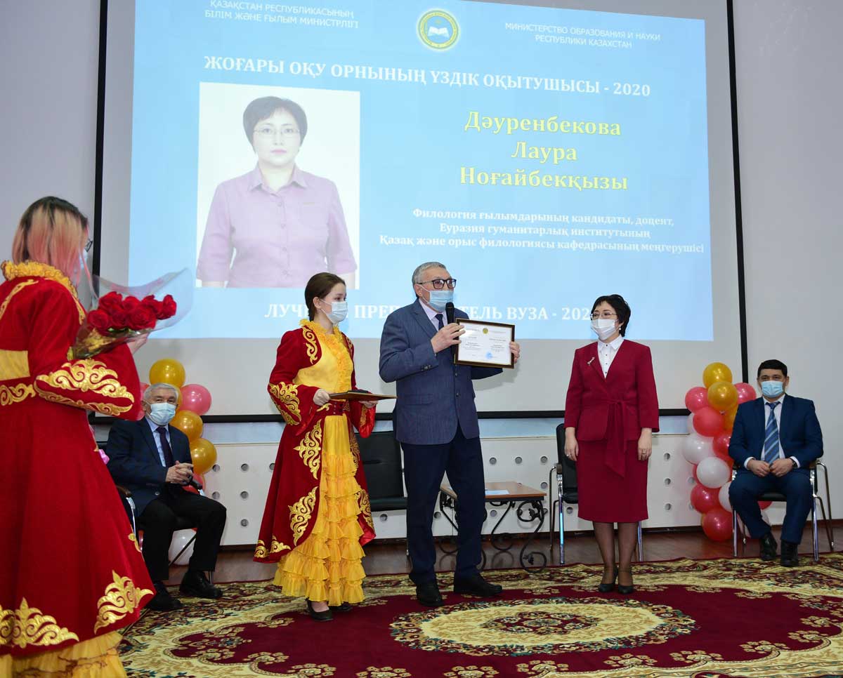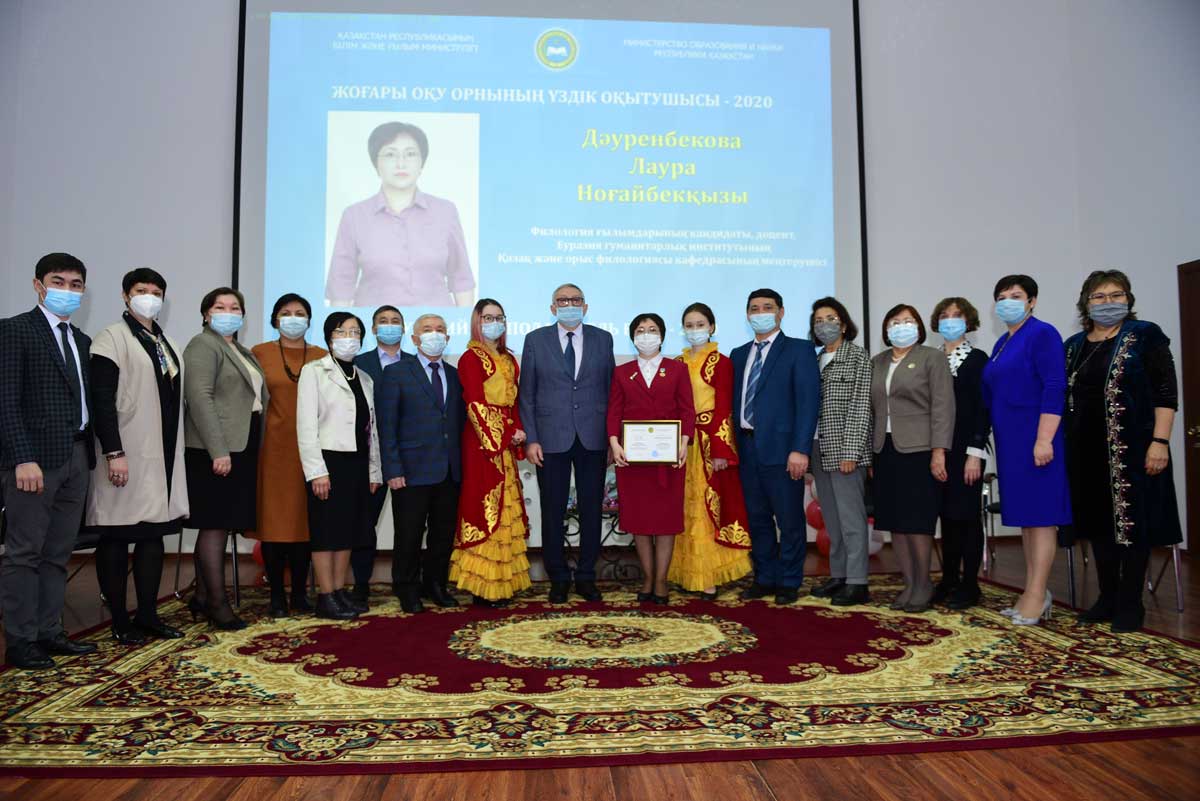 Далее в институте состоялось чествование победителя конкурса «Лучший преподаватель вуза 2020 года» – заведующей кафедрой казахской и русской филологии, к.ф.н., доцента Дауренбековой Л.Н.