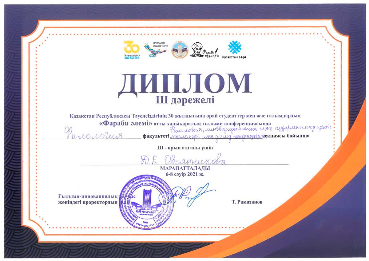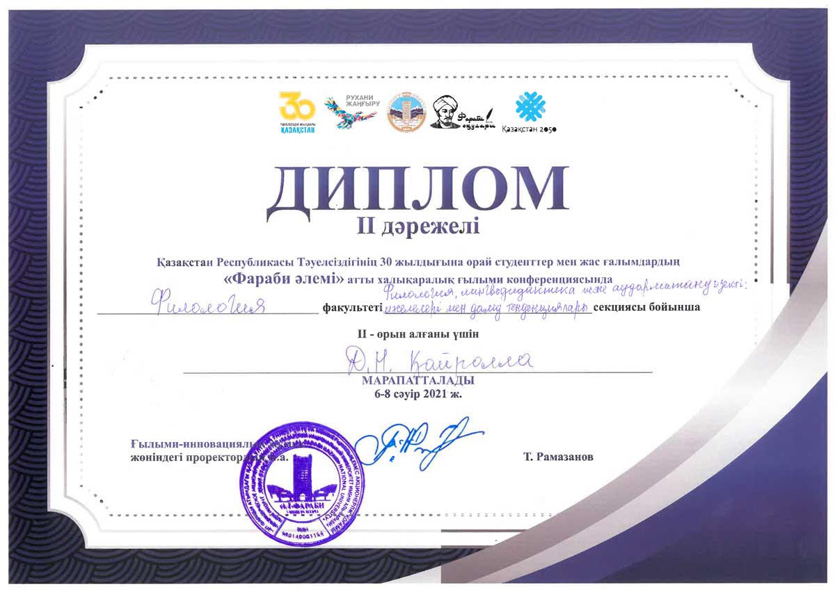 В работе секции «Филология, лингводидактика и переводоведение: актуальные вопросы и тенденции развития», наши студенты были отмечены дипломами: Қайролла Динара – 2 место и Овсянникова Дарья – 3 место.