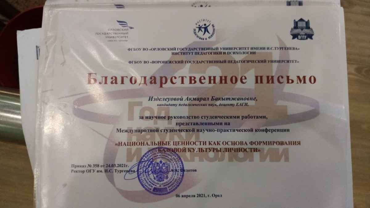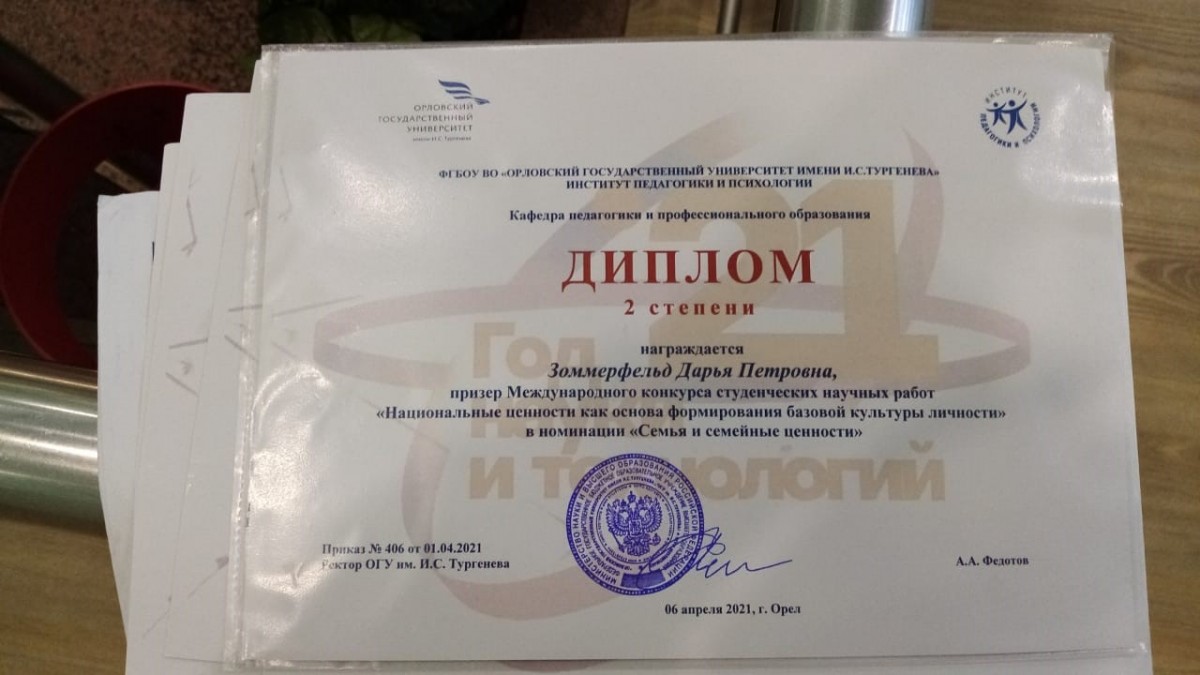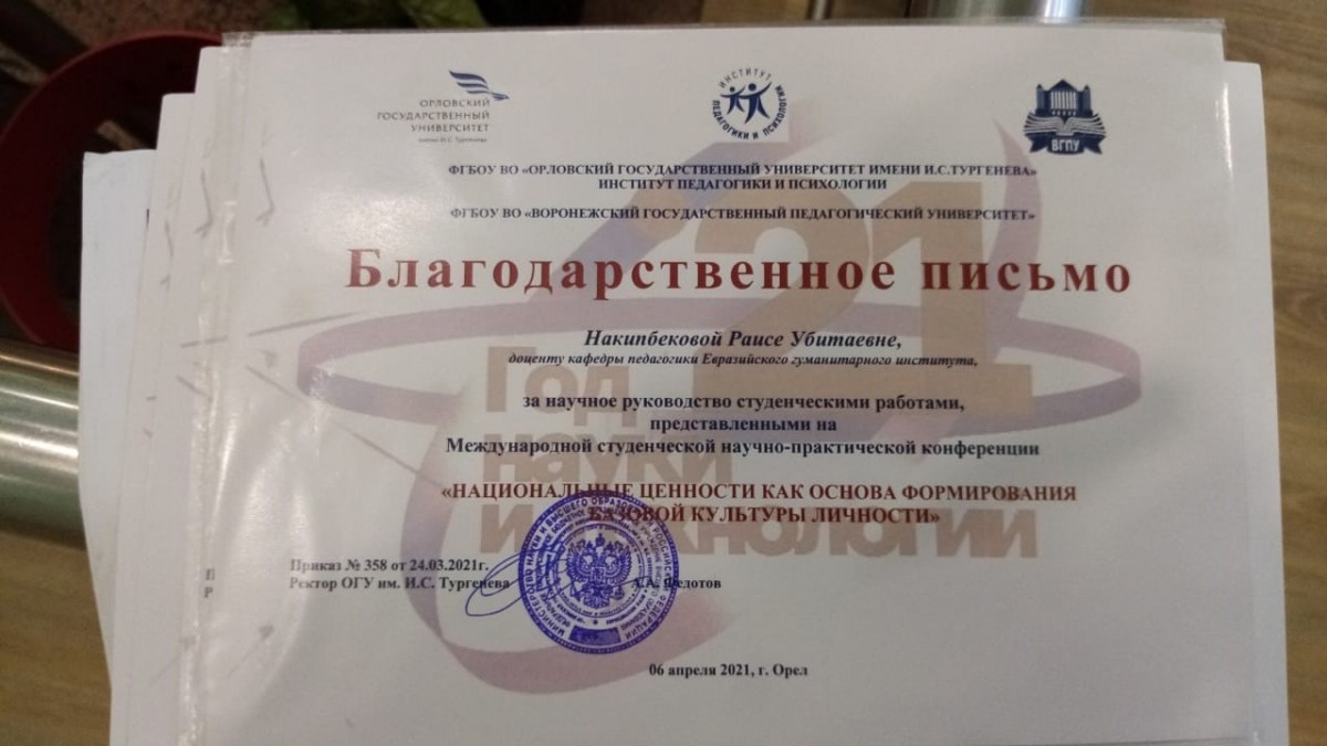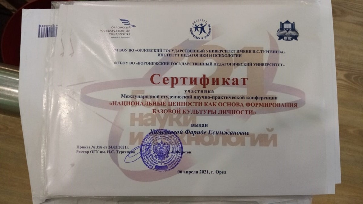 6 апреля 2021 года состоялась международная студенческая научно-практическая онлайн-конференция «Национальные ценности как основа формирования базовой культуры личности», проходившая на базе Орловского государственного университет имени И.С. Тургенева (Россия).