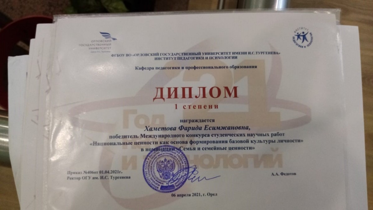 В номинации «Семья и семейные ценности» награждена дипломом I степени Хаметова Фарида (ПМНО 18-01, научный руководитель к.п.н, доцент Изделеуова А.Б.), дипломом II степени Зоммерфельд Дарья (ПМНО 17-01, научный руководитель к.п.н., доцент Накипбекова Р.У).
