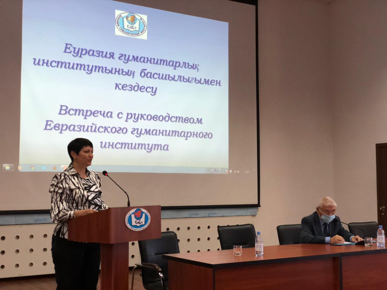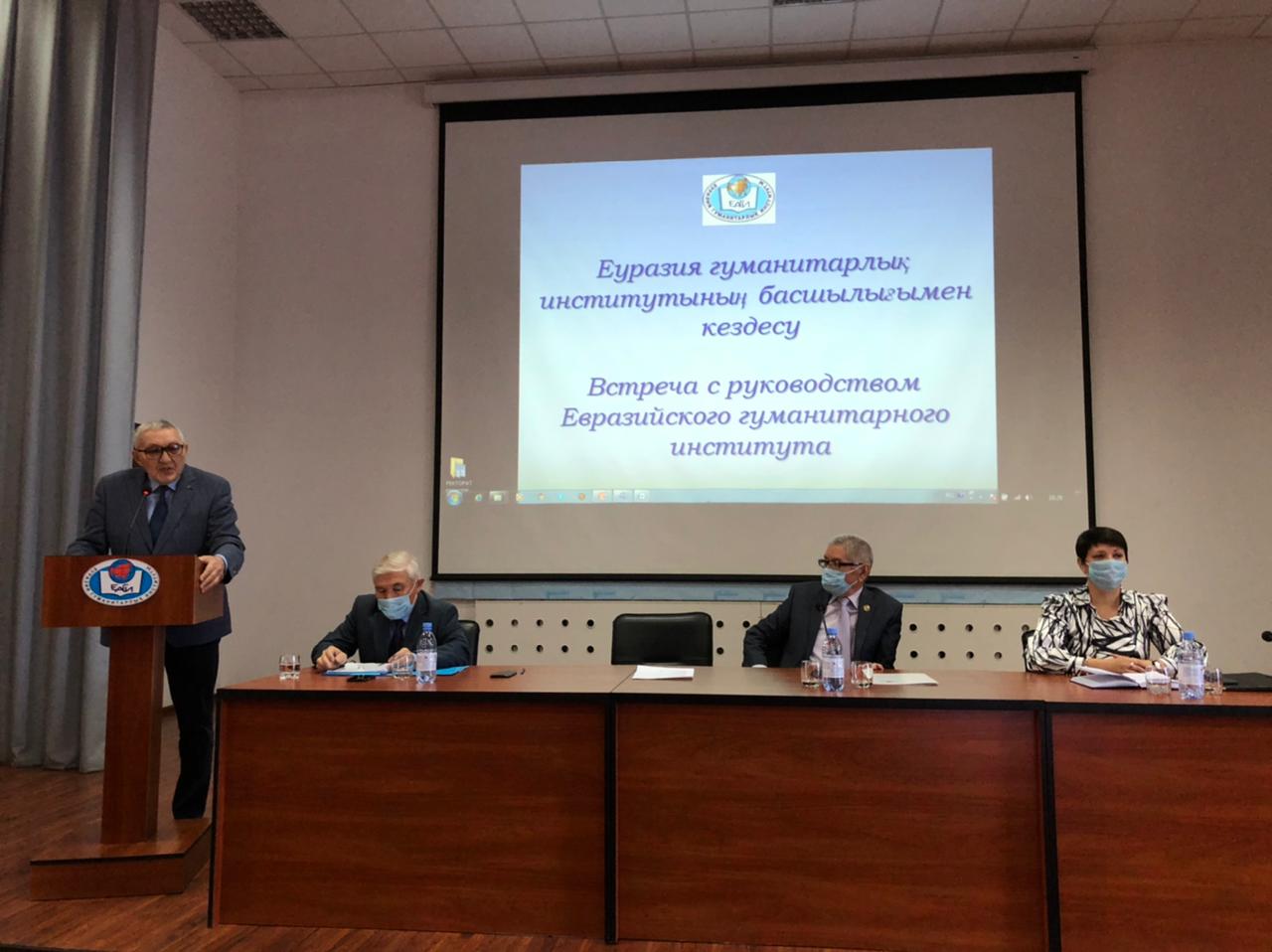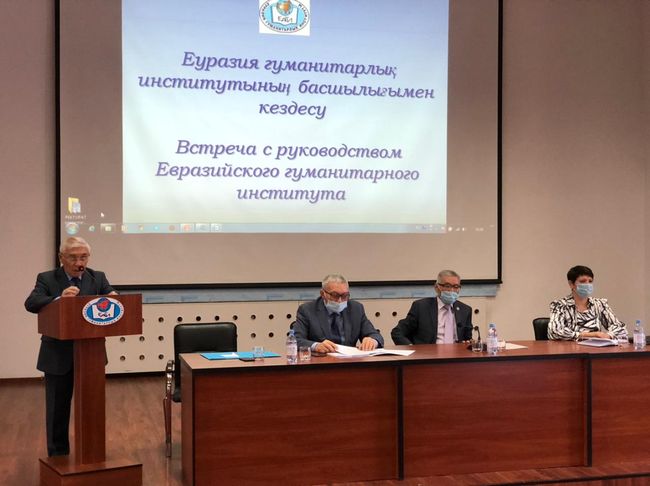 На встрече с руководством вуза вступительное слово было предоставлено ректору Евразийского гуманитарного института академику А.К. Кусаинову, который поздравил первокурсников с началом студенческой жизни, рассказал об истории и достижениях вуза.