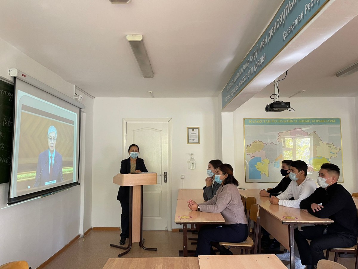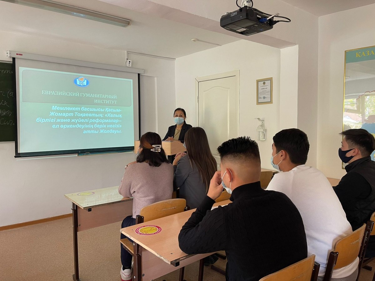 С 7 по15 сентября 2021 года в академических группах кафедры юридических дисциплин прошли кураторские часы по разъяснению Послания Президента Республики Казахстан К.Ж.Токаева народу Казахстана от 1.09.2021 г. «Единство народа и системные реформы – прочная основа процветания страны». С докладами выступили кураторы групп: доцент Альмухамбетов Ж.Н., старший преподаватель Мусынова Г.Е., старший преподаватель Тортаева А.Э. Студенты задали вопросы по интересующим их проблемам, отраженным в Послании Президента, обменялись мнениями. Также в ходе обсуждения были затронуты вопросы политической модернизации и защиты прав человека.