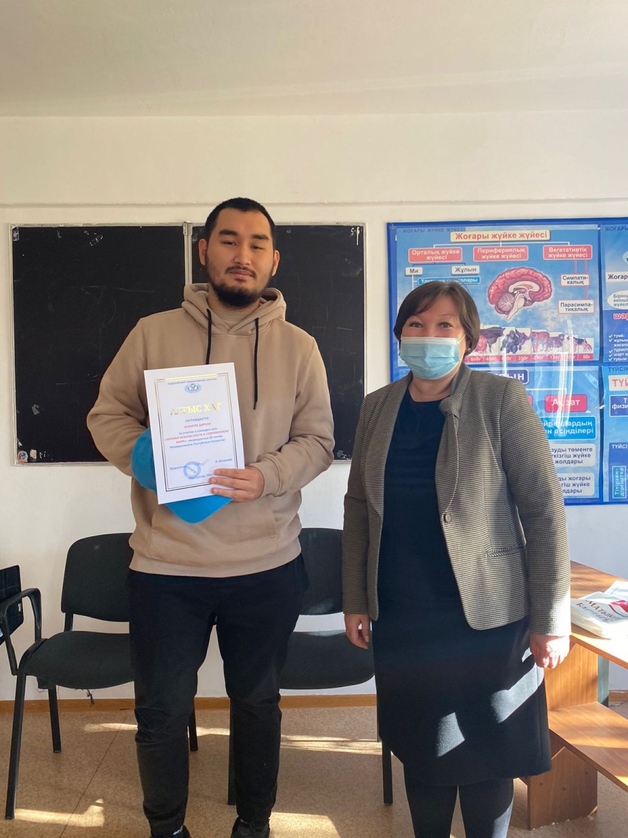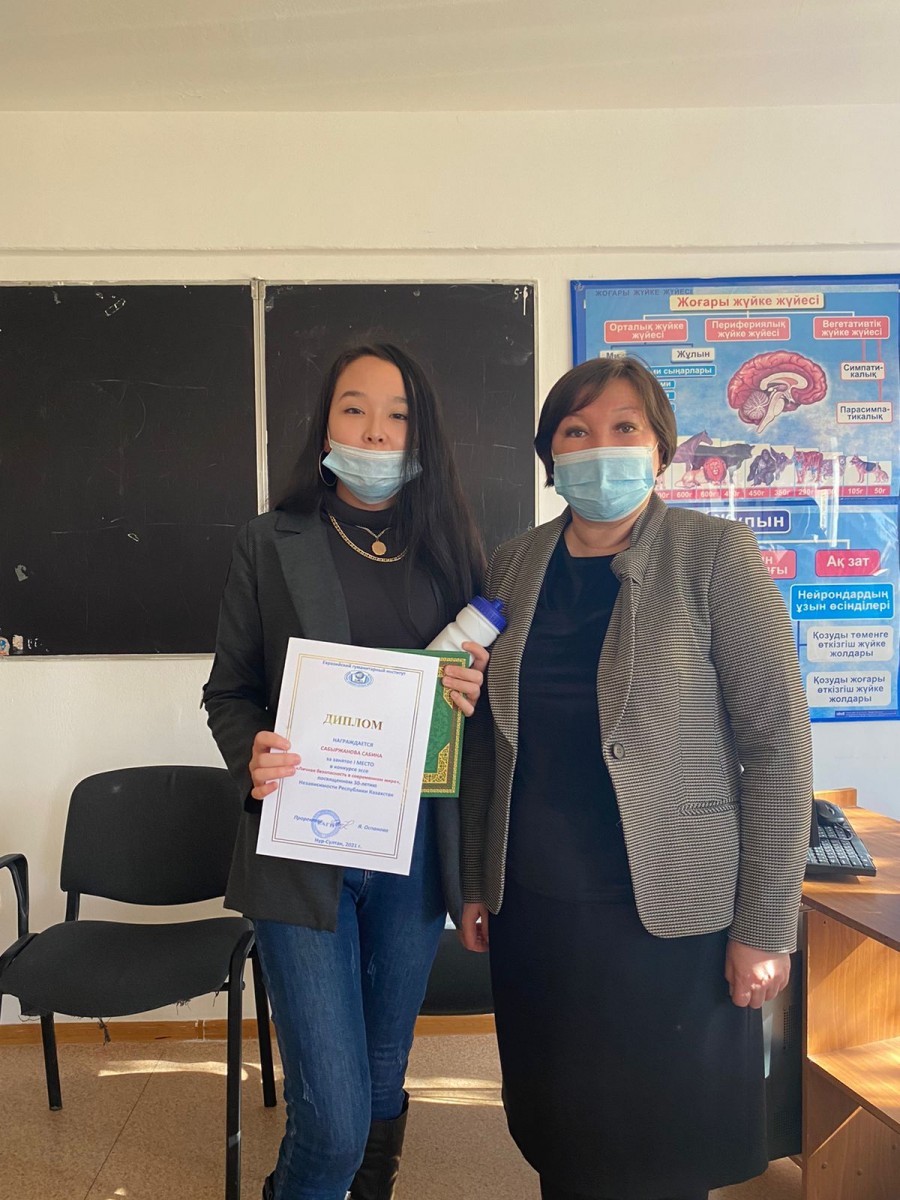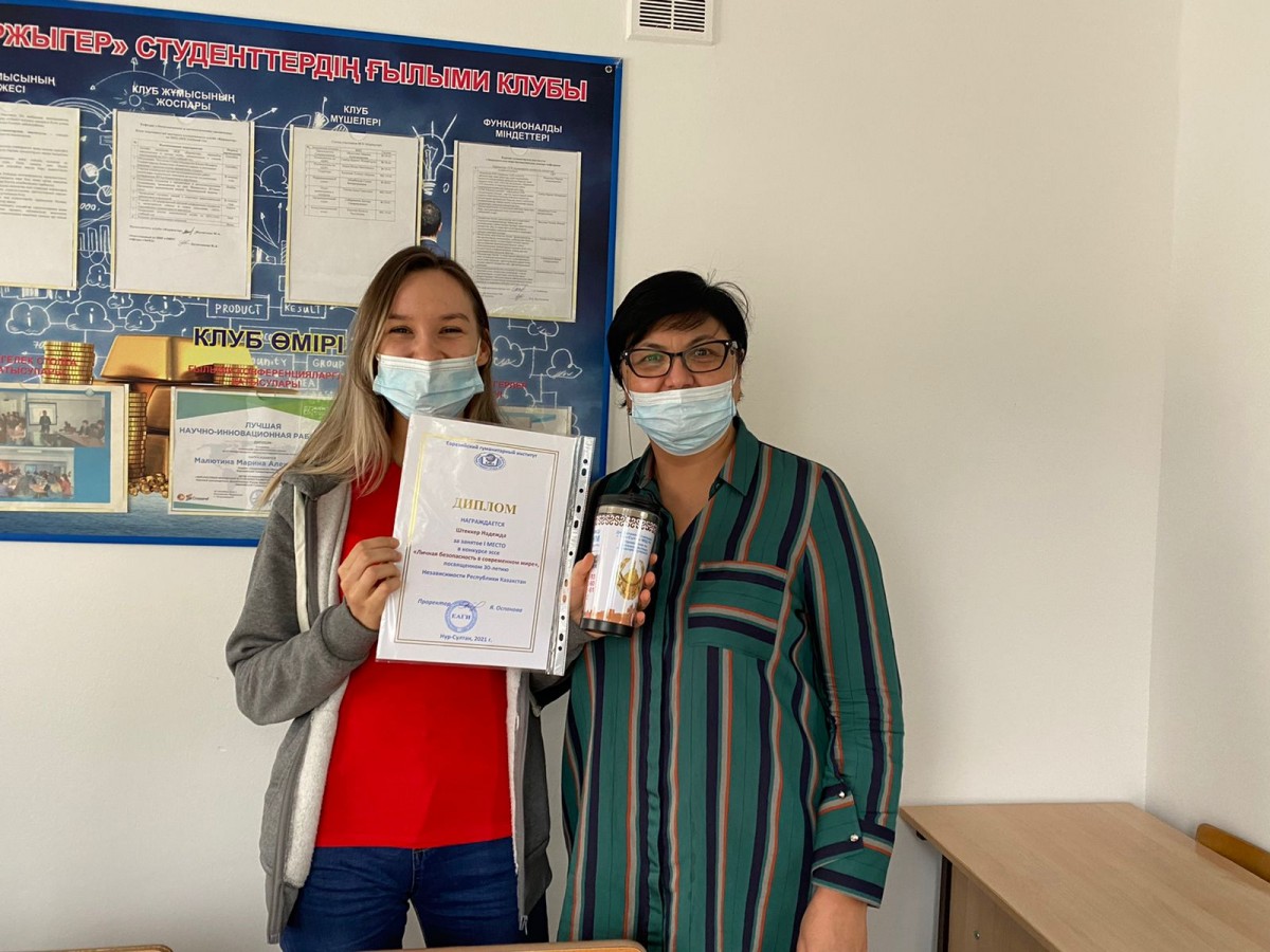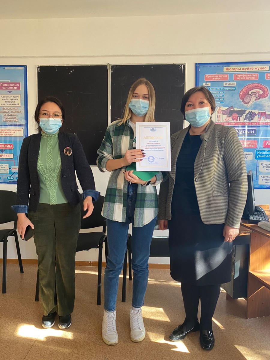 Победители конкурса – Штеккер Надежда ( группа Ф-18-01) и Сабыржанова Сабина (группа ПМНОК-18-01) – были награждены грамотами и ценными призами. Также благодарственными письмами и подарками были отмечены Гаврилова Елизавета (группа НО-19- 01), Әлібек Аружан (группа ППК-19- 01), Аскаров Дархан (группа ПП- 21-01).