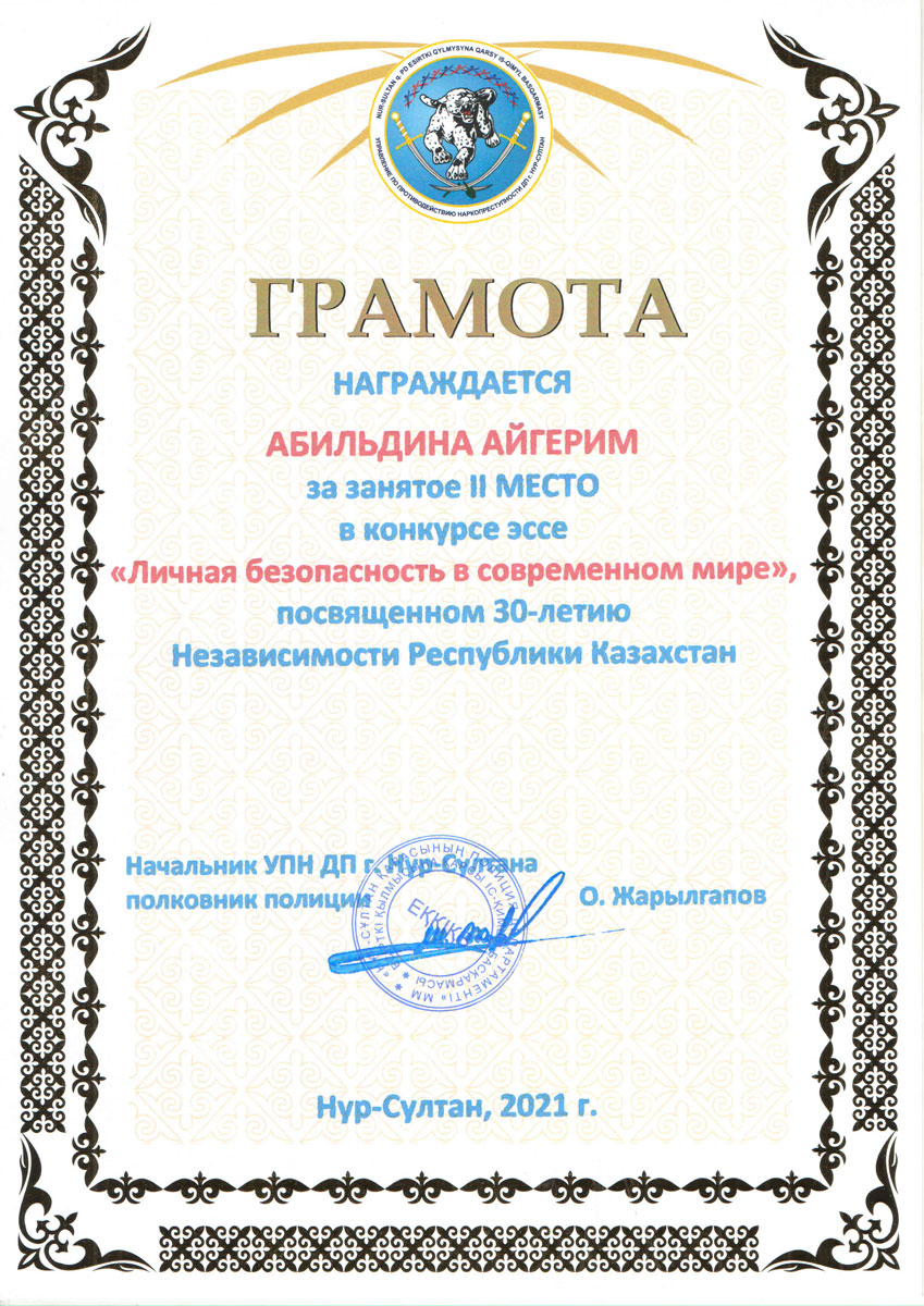 С 4 по 20 октября 2021 года в Евразийском гуманитарном институте проходил конкурс эссе на тему «Личная безопасность в современном мире», посвященный 30-летию Независимости Республики Казахстан, который был организован совместно с Управлением по противодействию наркопреступности Департамента полиции г.Нур-Султан. В конкурсе приняли участие студенты образовательной программы «Юриспруденция».