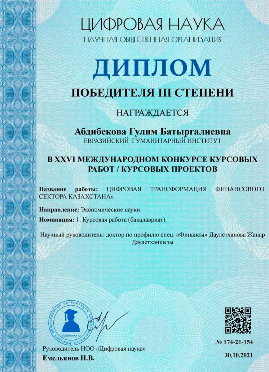 30 октября 2021 года студент  2 курса образовательной программы «Финансы» Абдибекова Гулим приняла  участие в XXVI международном онлайн конкурсе курсовых работ (направление: «Экономические науки») и завоевала диплом III степени. Тема работы: «Цифровая трансформация финансового сектора Казахстана»; научный руководитель: м.э.н., старший преподаватель Дәулетханова Ж.Д.  Научно – образовательная платформа: «Цифровая Наука» http://digitalnauka.ru (г. Саратов, РФ).