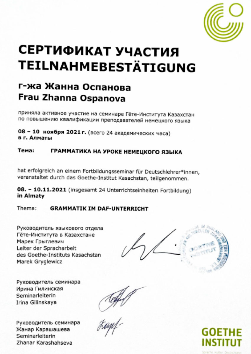 Все участники семинара получили сертификаты Гёте-Института в Казахстане.