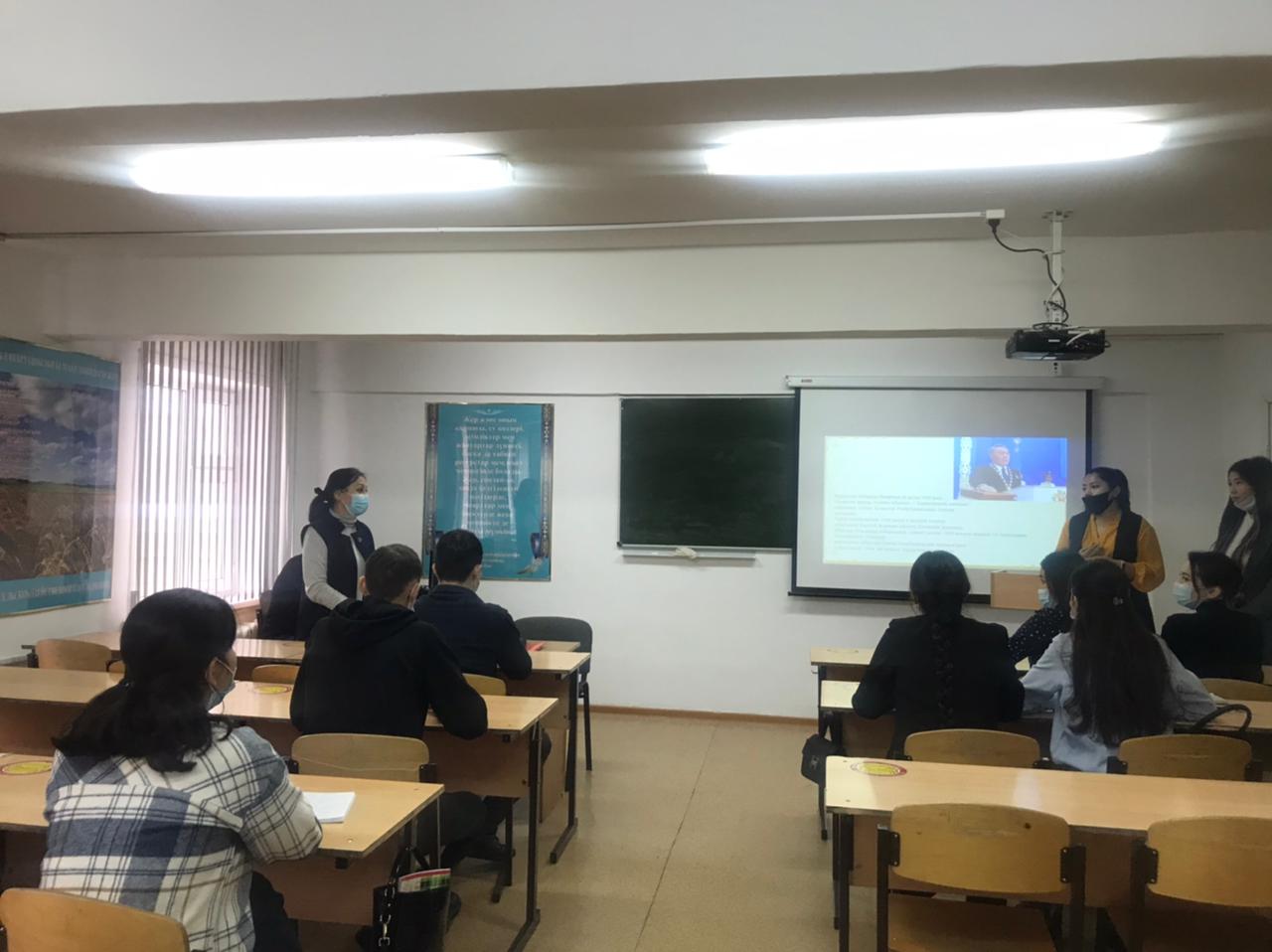 В ходе кураторского часа были обсуждены вопросы о роли Первого Президента страны Нурсултана Абишевича Назарбаева для казахского народа, о новых переменах в истории нации.