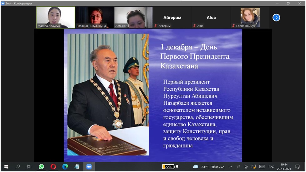 29 ноября 2021 года в группе ПДт-19-01 (3 курс, образовательная программа «Переводческое дело») прошел кураторский час, посвященный Дню Первого Президента. К данному мероприятию куратором группы, старшим преподавателем Никульшиной Н. В. была подготовлена презентация. Куратор рассказала студентам о жизни и деятельности Нурсултана Абишевича Назарбаева, о его трудах и наградах, об истории возникновения праздника. Студенты отметили значительную роль Лидера нации в становлении и развитии независимого Казахстана.