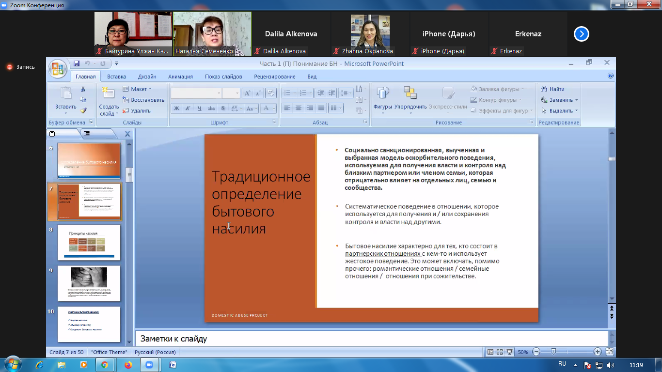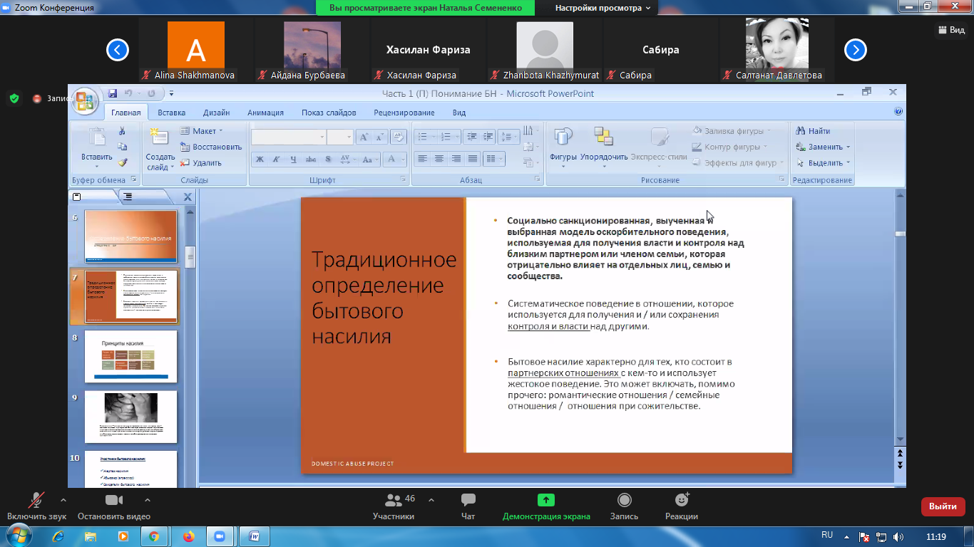 30 ноября 2021 г. для студентов образовательной программы «Иностранный язык: два иностранных языка» была прочитана в онлайн формате лекция на тему «Профилактика бытового насилия в семье и парах». Спикером выступила Семененко Наталья Николаевна, директор Психологического центра «Келешек», член комиссии по делам женщин и семейно-демографической политике при акиме г. Нур-Султан. По окончании лекции Семененко Н.Н. ответила на все интересующие студентов вопросы.