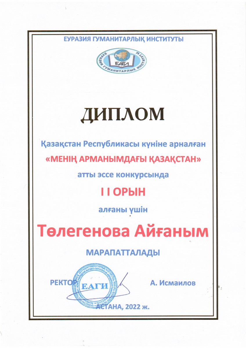Айгерим Абильдину, руководителя антикоррупционного клуба «Саналы Ұрпақ», студента группы ЮК-19-01 за занятое III место в конкурсе проектов, направленных на формирование антикоррупционной культуры среди молодежи, проводимого Департаментом Агентства Республики Казахстан по противодействию коррупции по г. Нур-Султан и Управлением по вопросам молодежной политики акимата г. Нур-Султан.