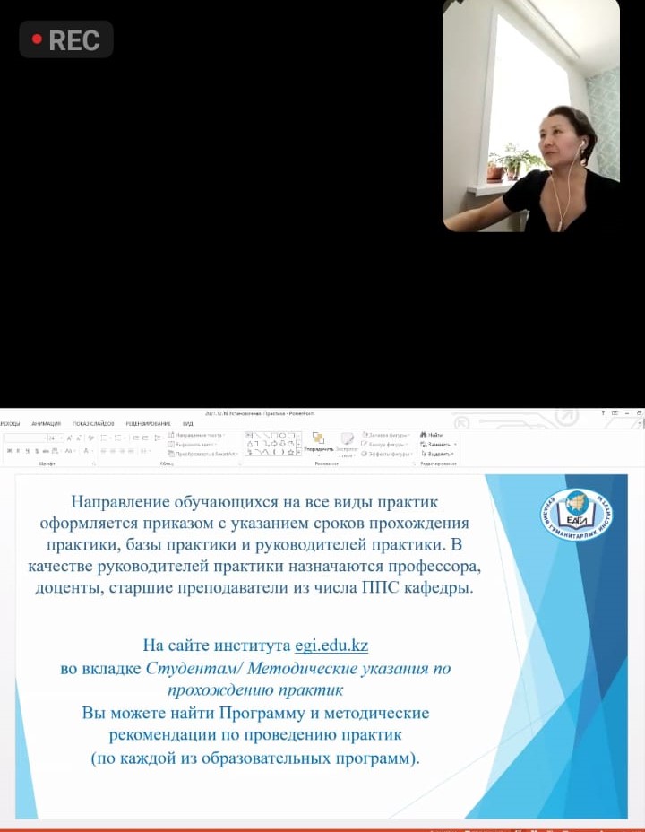 Кафедрой педагогики (в лице ответственного по практике, старшего преподавателя Г.Е. Жармахановой) 10 декабря 2021 года в онлайн формате была проведена установочная конференция по практике со студентами очного и очного дистанционного отделений образовательных программ «Педагогика и методика начального обучения», «Педагогика и психология», «Дошкольное обучение и воспитание», «История». В конференции также приняли участие координатор профессиональной практики и карьеры Оспанова А.Т. и руководители практики из числа ППС кафедры. В рамках установочной конференции были рассмотрены все самые основные вопросы: график прохождения практики студентами очного и очного дистанционного отделений, программа практики, обязанности студентов, требования к отчетной документации и т.д. Кроме того, студенты получили исчерпывающие ответы на имеющиеся у них вопросы.