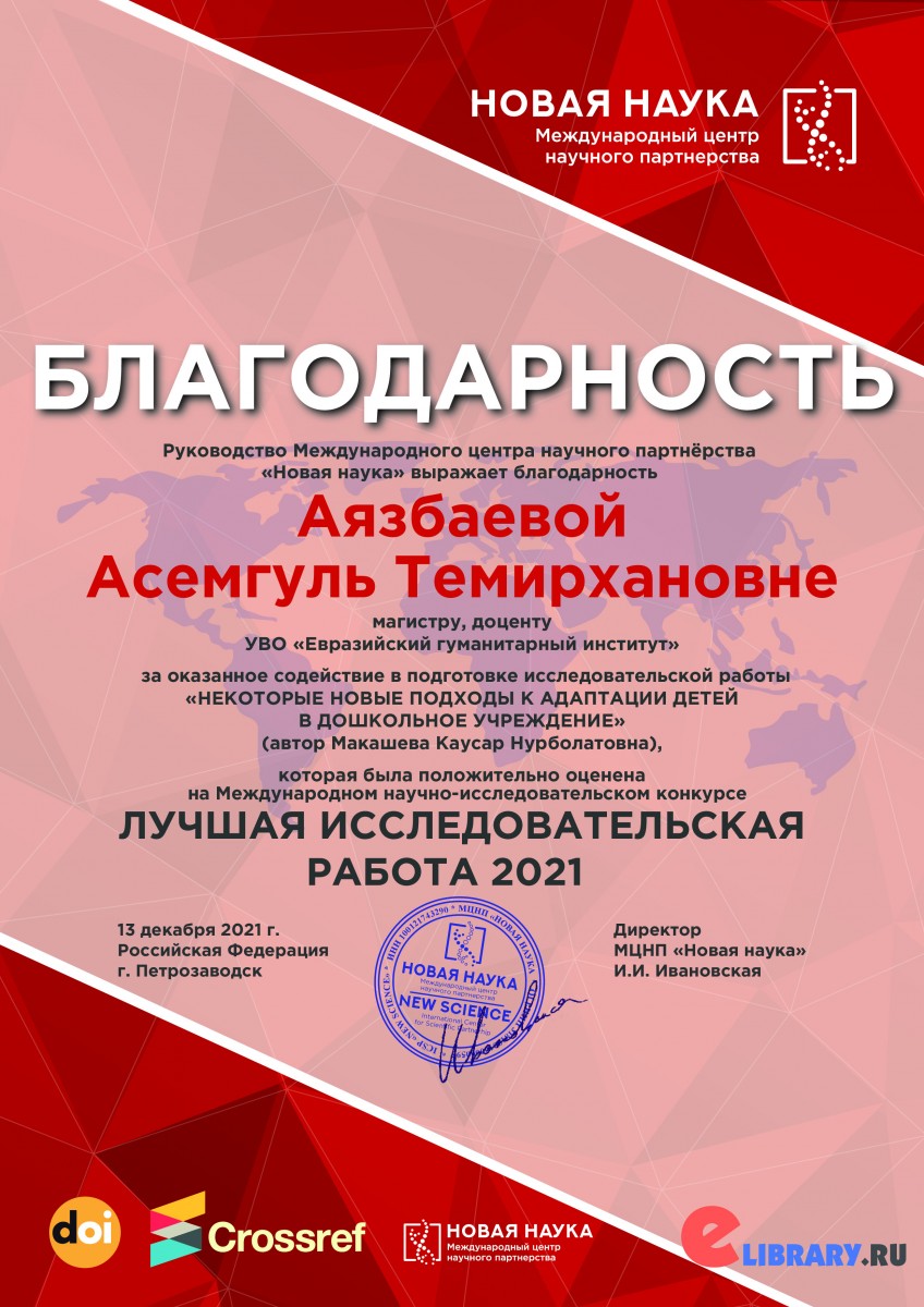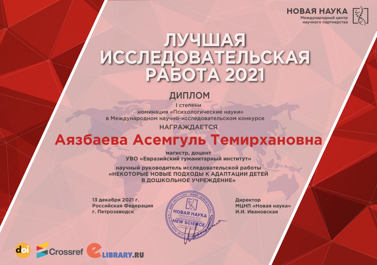 13 декабря 2021 года студент 3 курса образовательной программы «Педагогика и психология» Макашева Каусар Нурболатовна приняла онлайн участие в международном научно-исследовательском конкурсе «Лучшая исследовательская работа 2021» по направлению: «Психологические науки» и завоевала диплом I степени. Тема работы: «Некоторые новые подходы к адаптации детей в дошкольное учреждение»; научный руководитель: м.соц.н., доцент кафедры педагогики Аязбаева Асемгуль Темирхановна. Научно – образовательная платформа: https://sciencen.org/novaja-nauka-konkursy/arhiv-konkursov/ г. Петрозаводск (РФ).